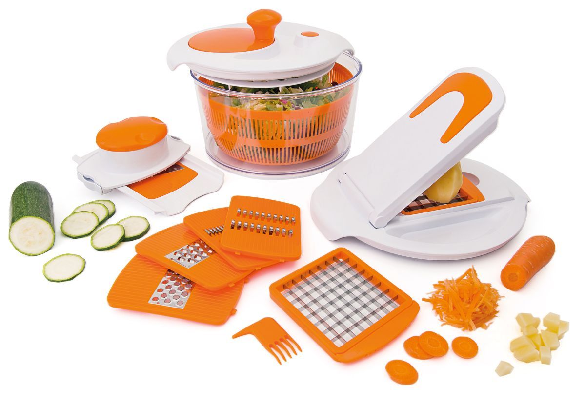 Abili di Excélsa è l'asciugainsalata manuale con accessori. Permette di asciugare l'insalata, affettare, tritare, gratuggiare, tagliare a cubetti, a rondelle, a julienne! Come? Sfruttando il movimento della forza centrifuga e applicando la lama corretta Alibi diventerà il tuo infallibile alleato in cucina.