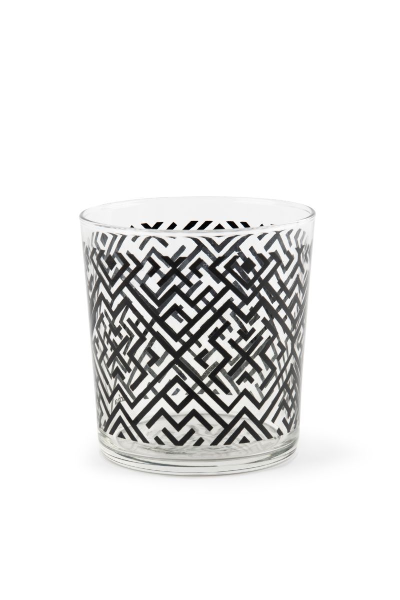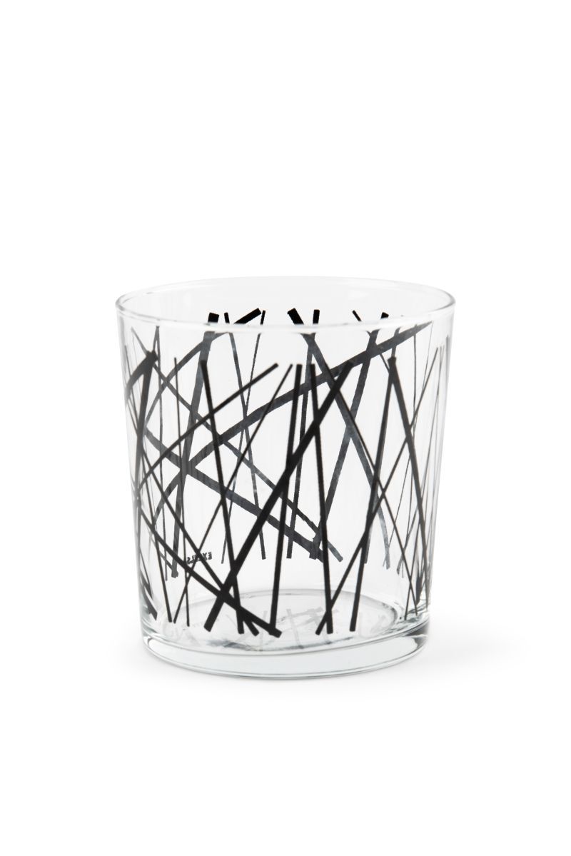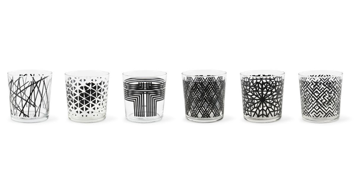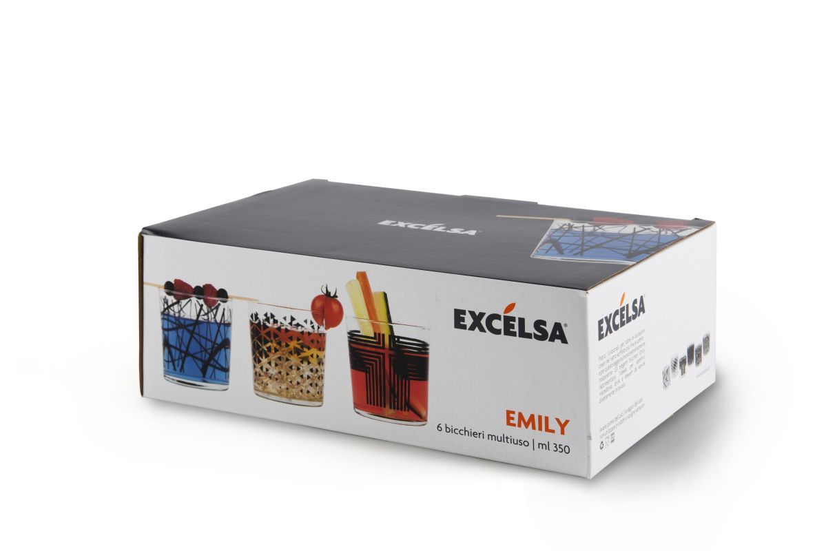 I bicchieri acqua della collezione Emily sono personalizzati con la fantasia che contraddistingue proprio questa serie: forme geometriche stilizzate di colore nero su vetro trasparente. Grazie alla loro leggera forma conica i bicchieri Emily sono impilabili.