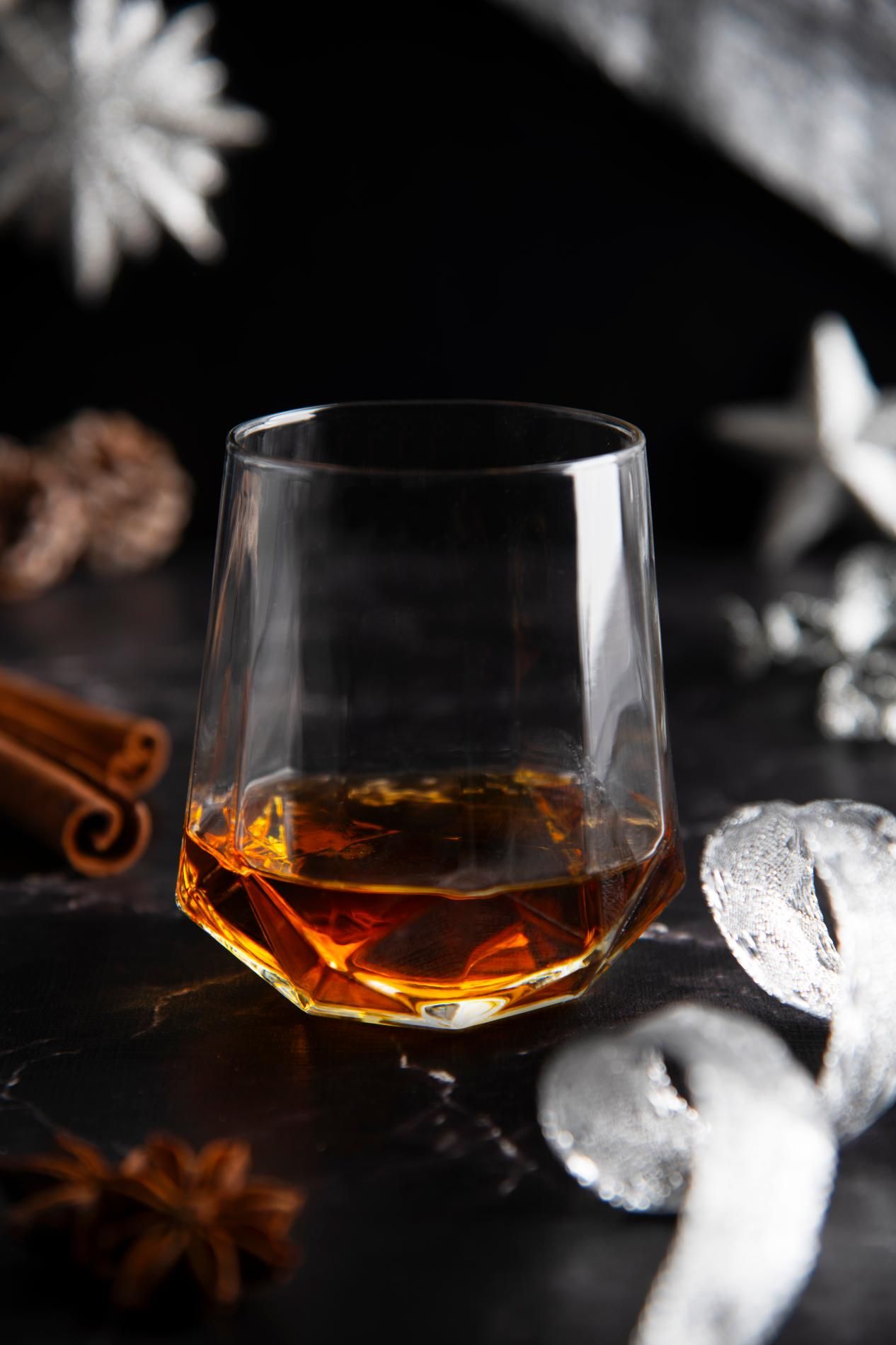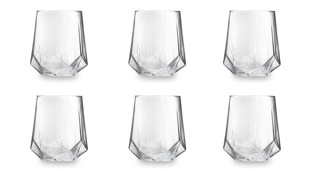 In vetro trasparente, ogni bicchiere ha il fondo che richiama la forma di un diamante rendendo il prodotto contemporaneo e molto elegante.