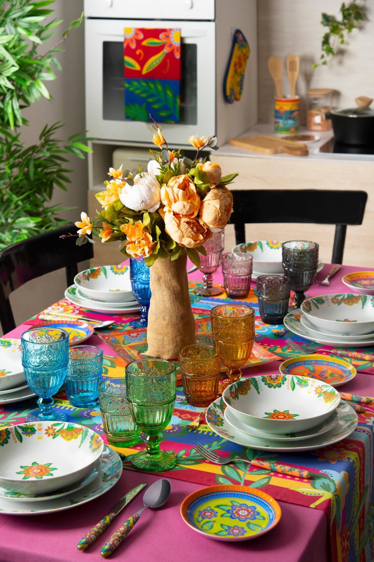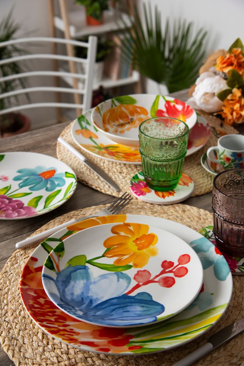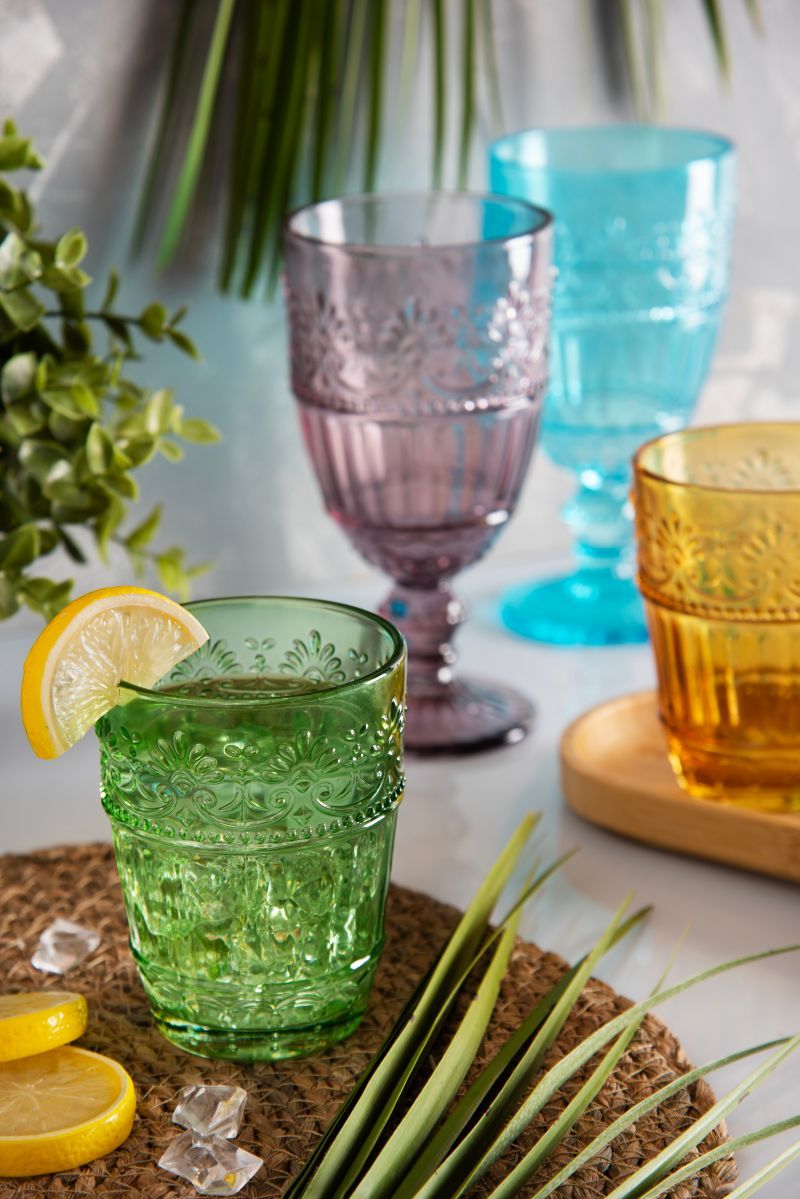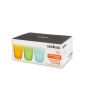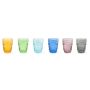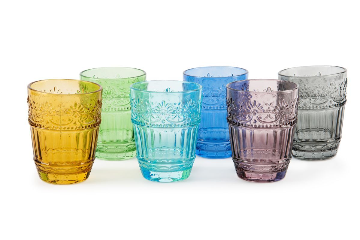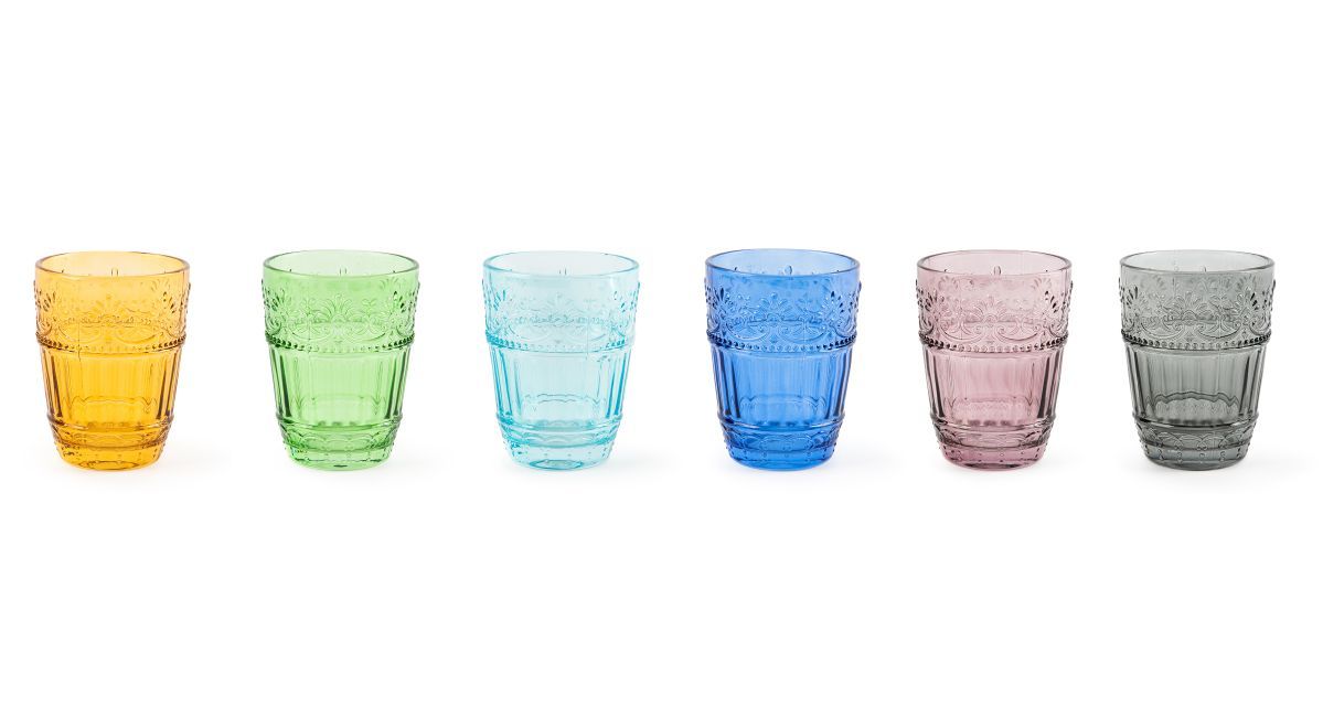 I bicchieri Country Flower di Excélsa sono venduti in confezione da 6 pezzi. Capacità 300 ml cadauno. Ogni bicchiere ha una diversa colorazione: rosa, arancione, verde, azzurro, blu e grigio scuro.