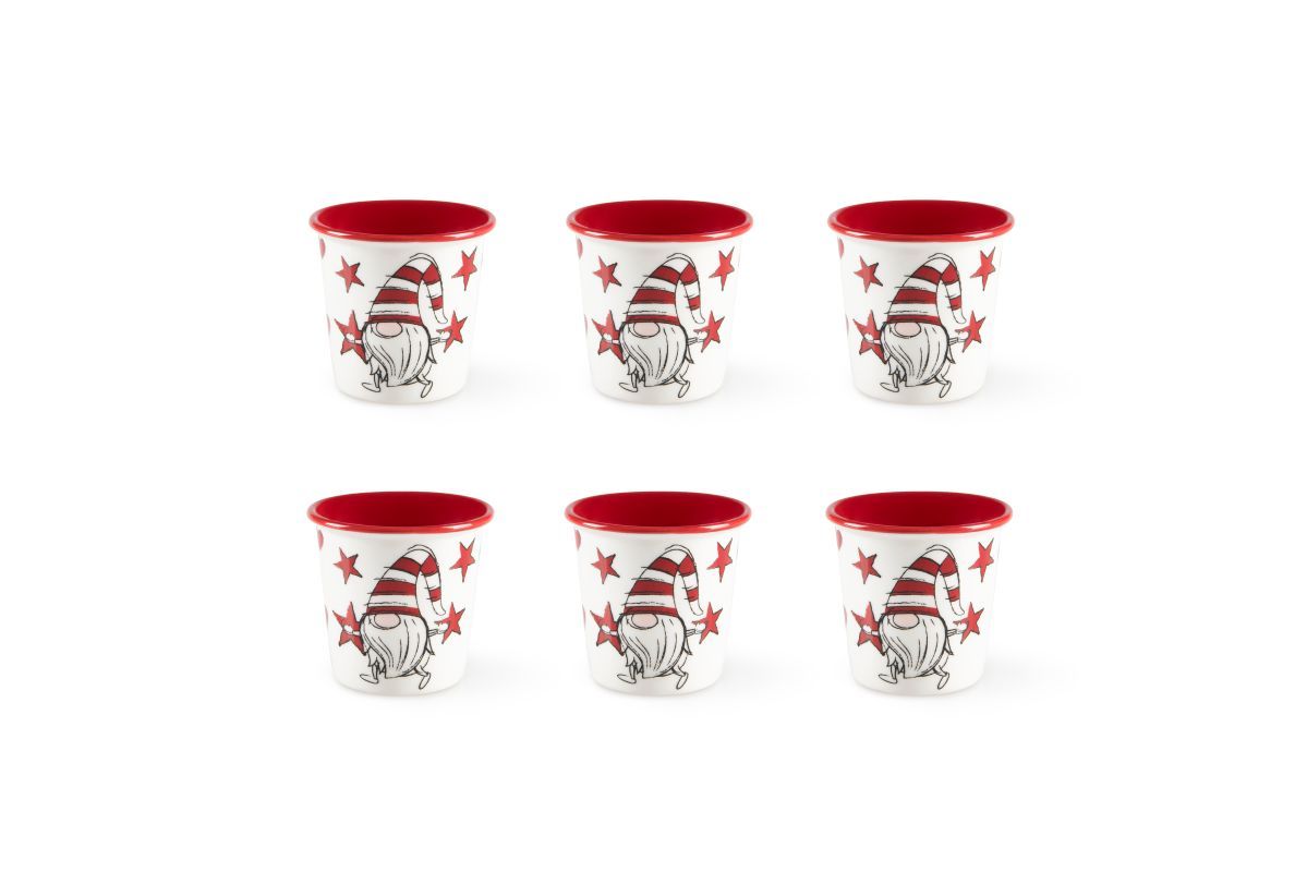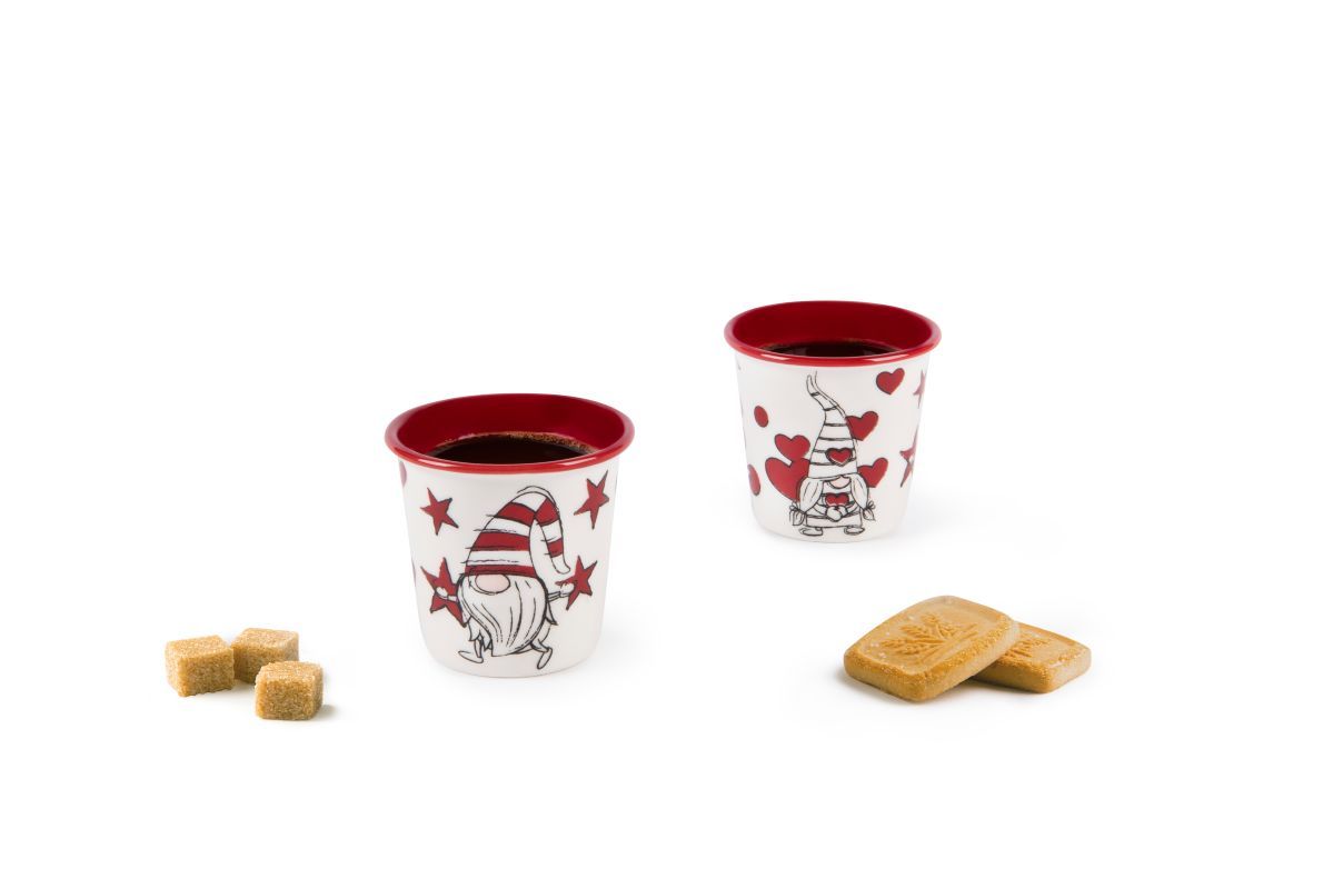 Gnome Sweet Home di Excélsa è la collezione di bicchierini da caffè natalizi in porcellana decorata con gnomi stilizzati, cuoricini e stelline.