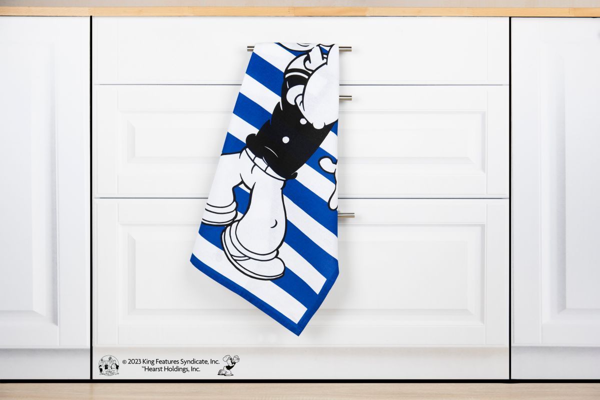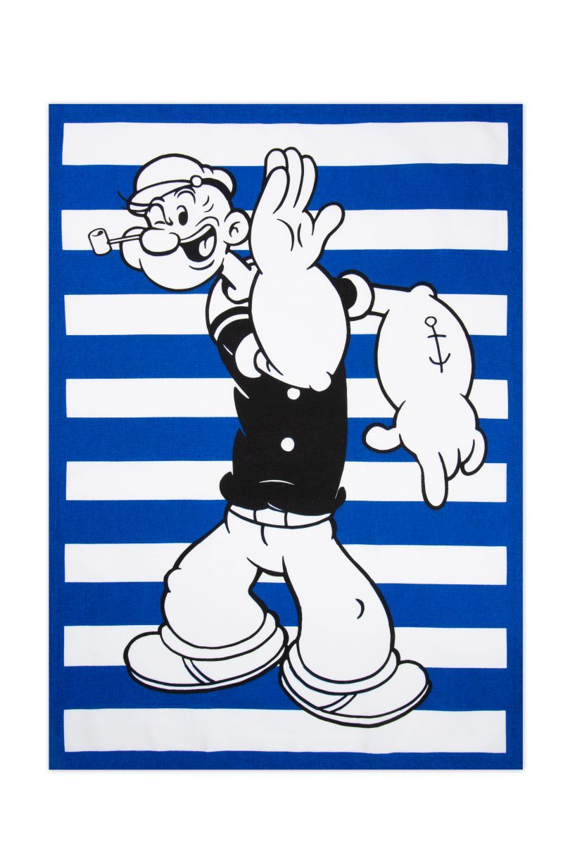 Il canovaccio Braccio di Ferro della collezione Popeye è 100% cotone 200 gr/m2 con stampa multicolore e l'originale fantasia su fondo blu con righe bianche. Lavabile in lavatrice a 40°. Dimensioni 50x70 cm.