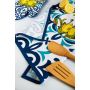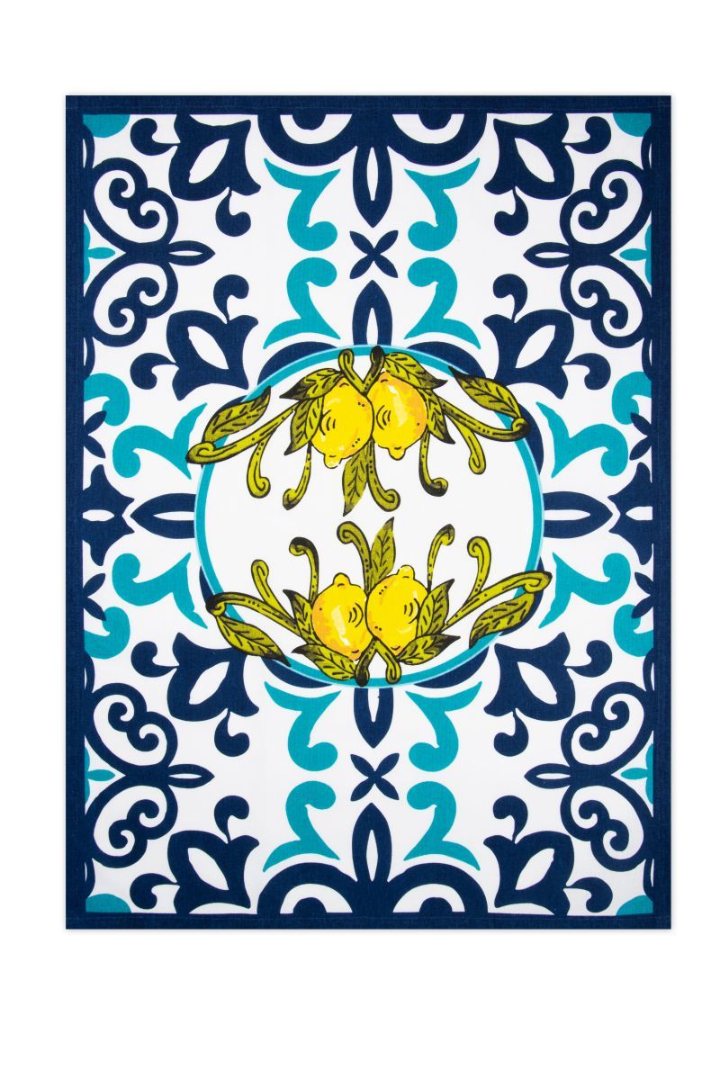Il canovaccio Amalfi di Excélsa è 100% cotone 200 gr/m2 con stampa multicolore e l'originale fantasia ispirata ai limoni della costiera Amalfitana con fregi azzurri-blu stilizzati.