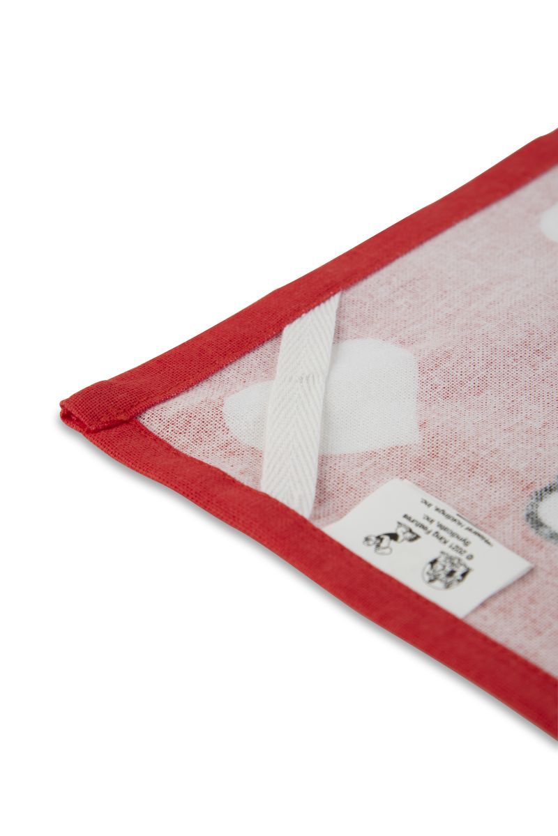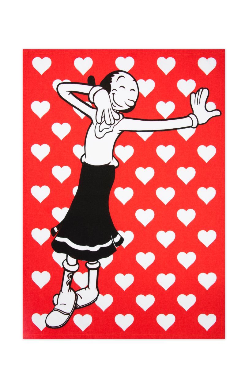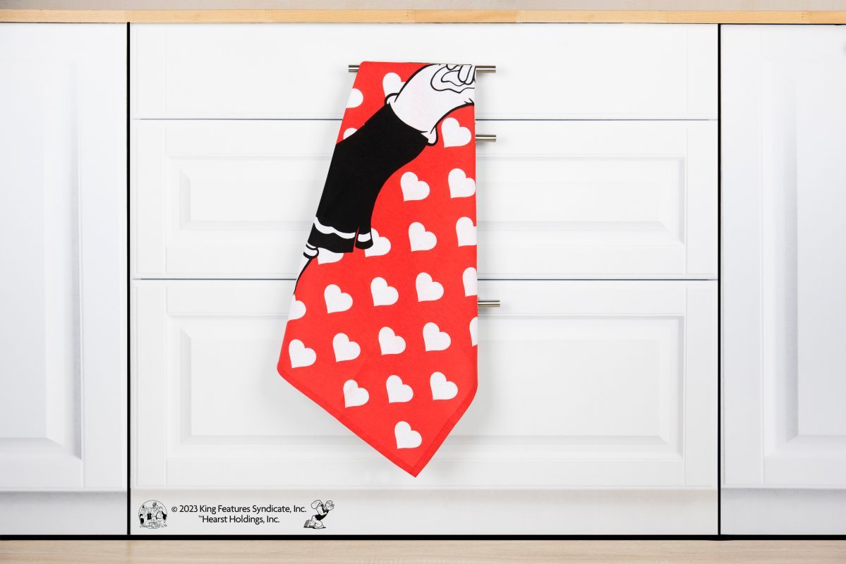 Il canovaccio Olivia della collezione Popeye è 100% cotone 200 gr/m2 con stampa multicolore e l'originale fantasia su fondo rosso con cuoricini bianchi. Lavabile in lavatrice a 40°. Dimensioni 50x70 cm.