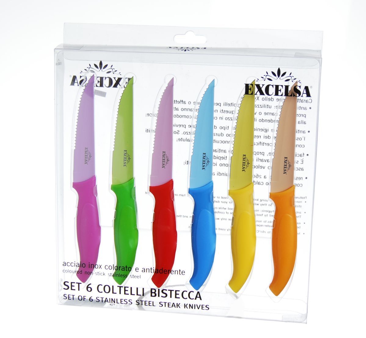 I coltelli da bistecca Color di Excélsa sono perfetti per tagliare la carne grazie alla lama seghettata. Ogni coltello ha un colore diverso, con manicatura ergonomica e lama in acciaio inox antiaderente e antibatterico.