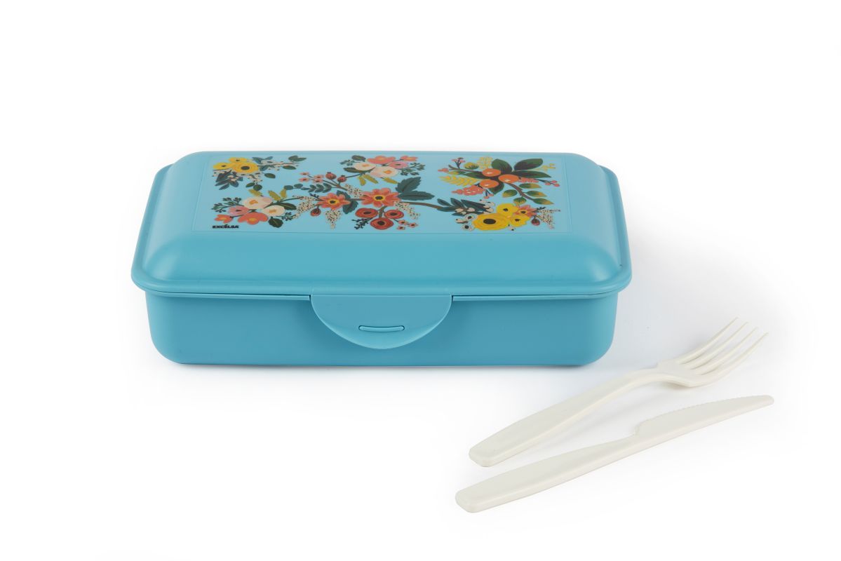 - Contenitore portapranzo con posate, floreale, azzurro