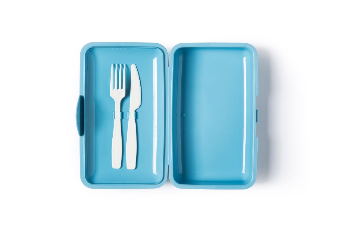La confezione include un set di posate (forchetta e coltello) in materiale plastico che possono essere utilizzate a necessità. Il contenitore si chiude a pressione, tuttavia non è ermetico e termico. Le sue dimensioni sono 22x13 cm.