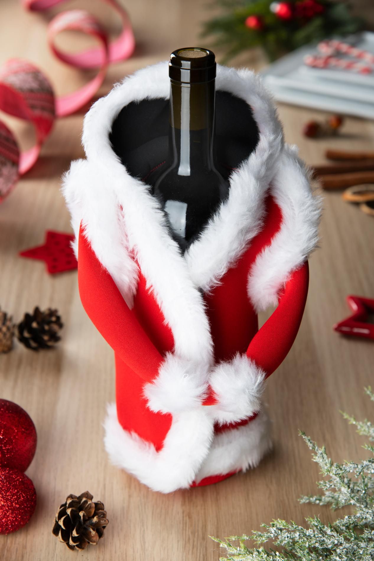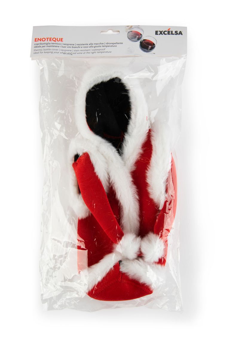 Porta in tavola l'allegria di una bottiglia di vino "mascherata" da babbo Natale! Con il copribottiglia natalizio Enoteque di Excélsa puoi mantenere al fresco il vino più a lungo.