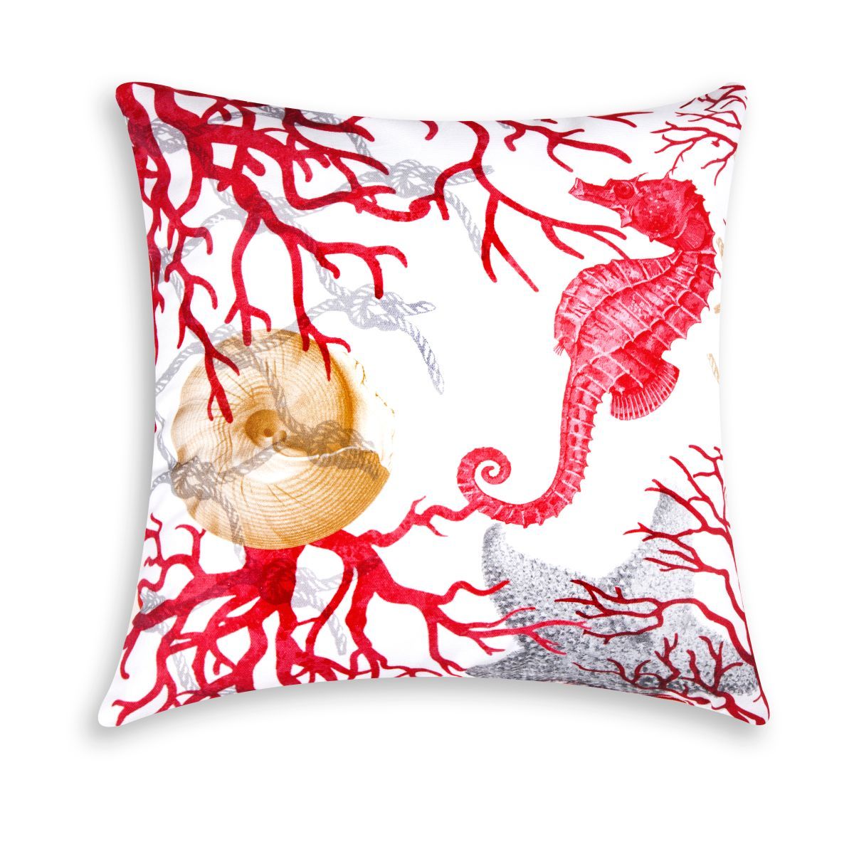 Il cuscino arredo Coral di Excélsa è ideale per arredare gli ambienti interni della casa con un tocco speciale in stile marino e estivo. Il fronte è decorato con coralli, conchiglie e cavallucci marini, il retro è in tonalità piena. Completo di fodera e imbottitura le misure del cuscino decorativo Ocean sono 45x45 cm, comoda zip per estrarre l'imbottitura.