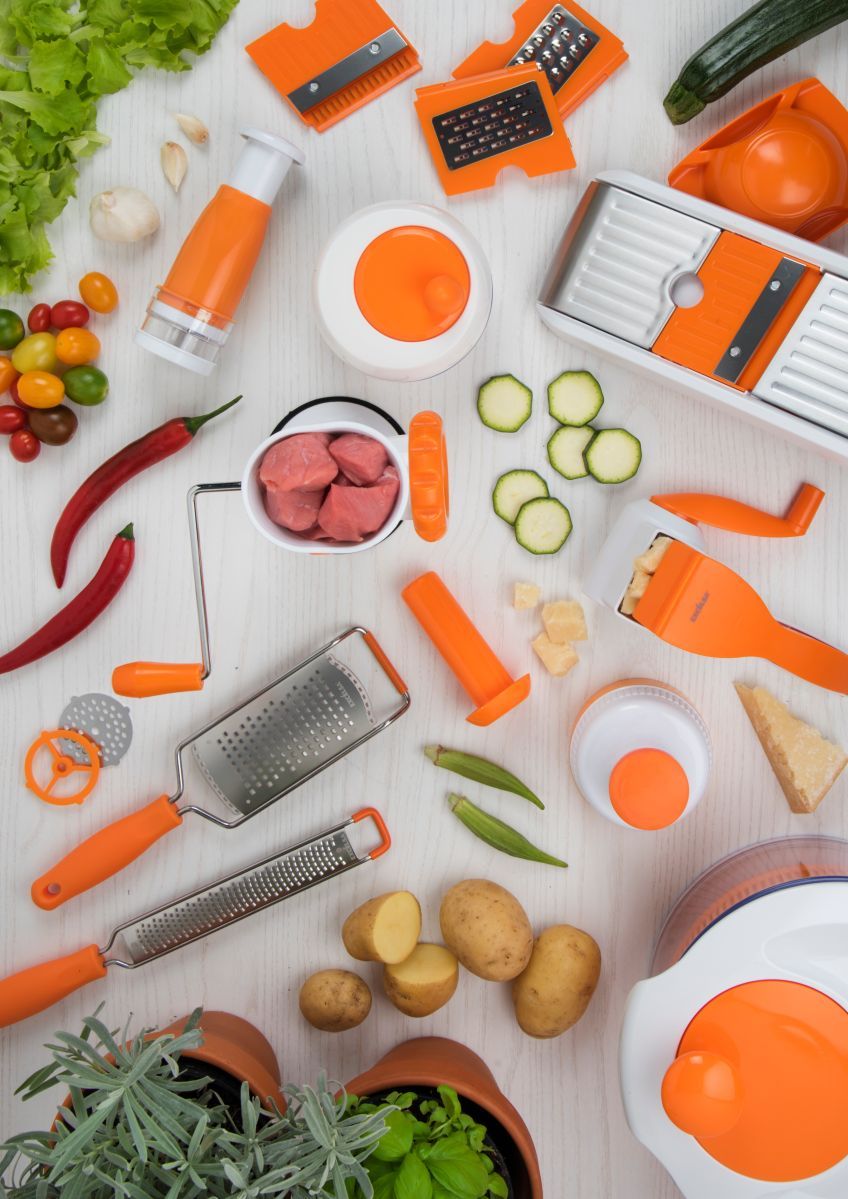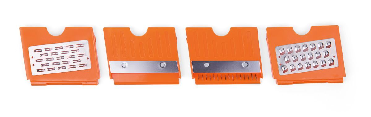 Abili di Excélsa è la mandolina manuale con accessori multifunzione. Le quattro lame in acciaio sono intercambiabili e permettono di ottenere diverse consistenze dell'ingrediente che si desidera affettare o gratuggiare.
