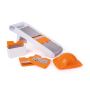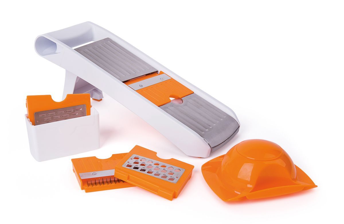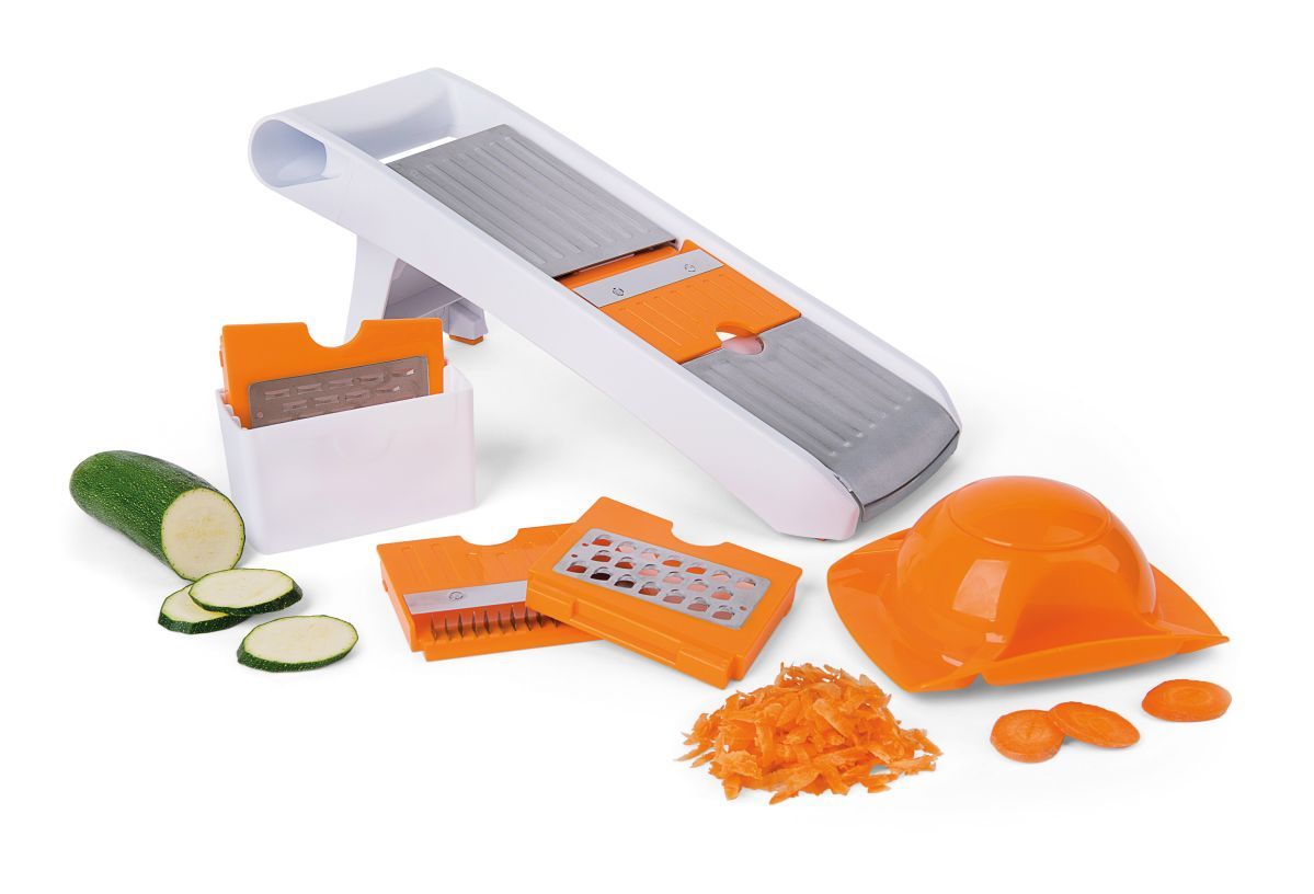 Le quattro differenti regolazioni permettono di ottenere spessori di taglio differenti. L'impugnatura della mandolina è ergonomica e la sua base antiscivolo. Può essere ripiegata su se stessa salvando spazio nel cassetto.