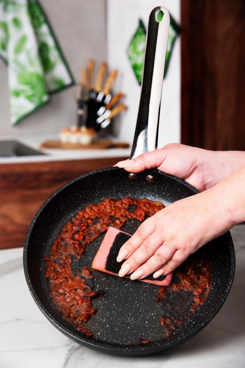 - rimuovi i residui di cibo con un pezzetto di carta assorbente o con un utensile di legno o di nylon;