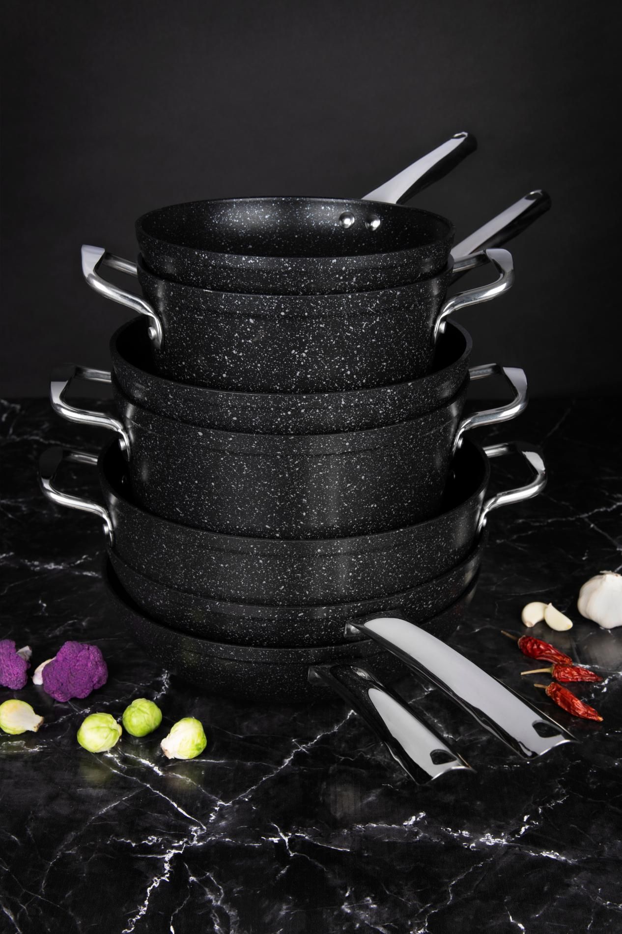 Five Stars è la collezione di Excélsa di padelle, tegami e casseruole in alluminio forgiato con rivestimento interno a 3 strati di colore nero.