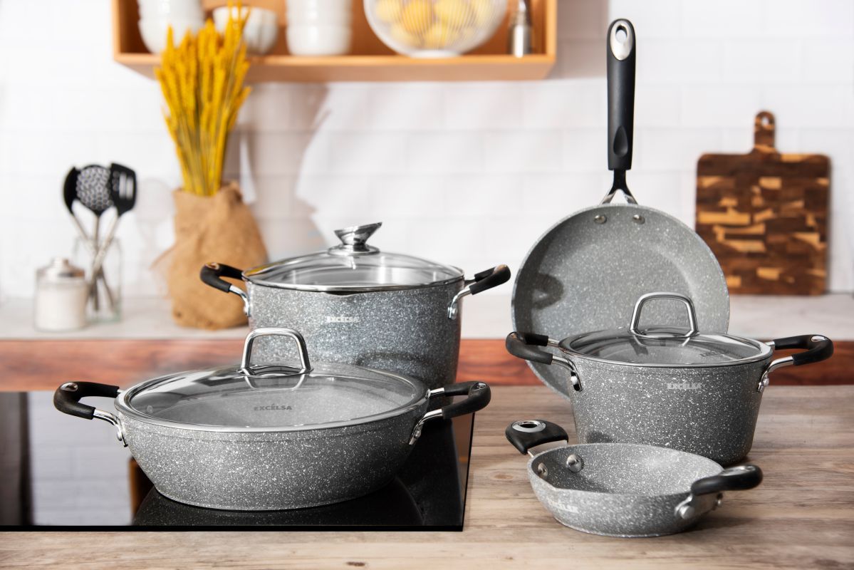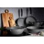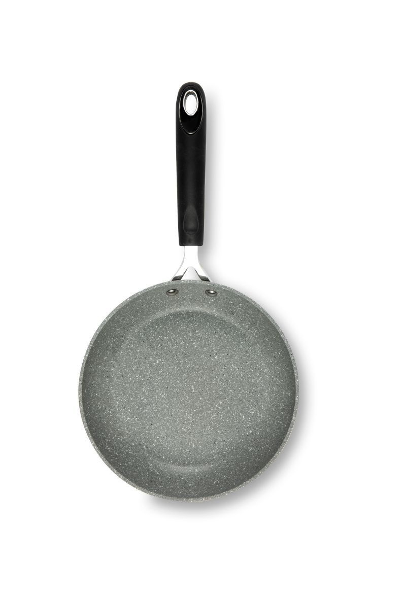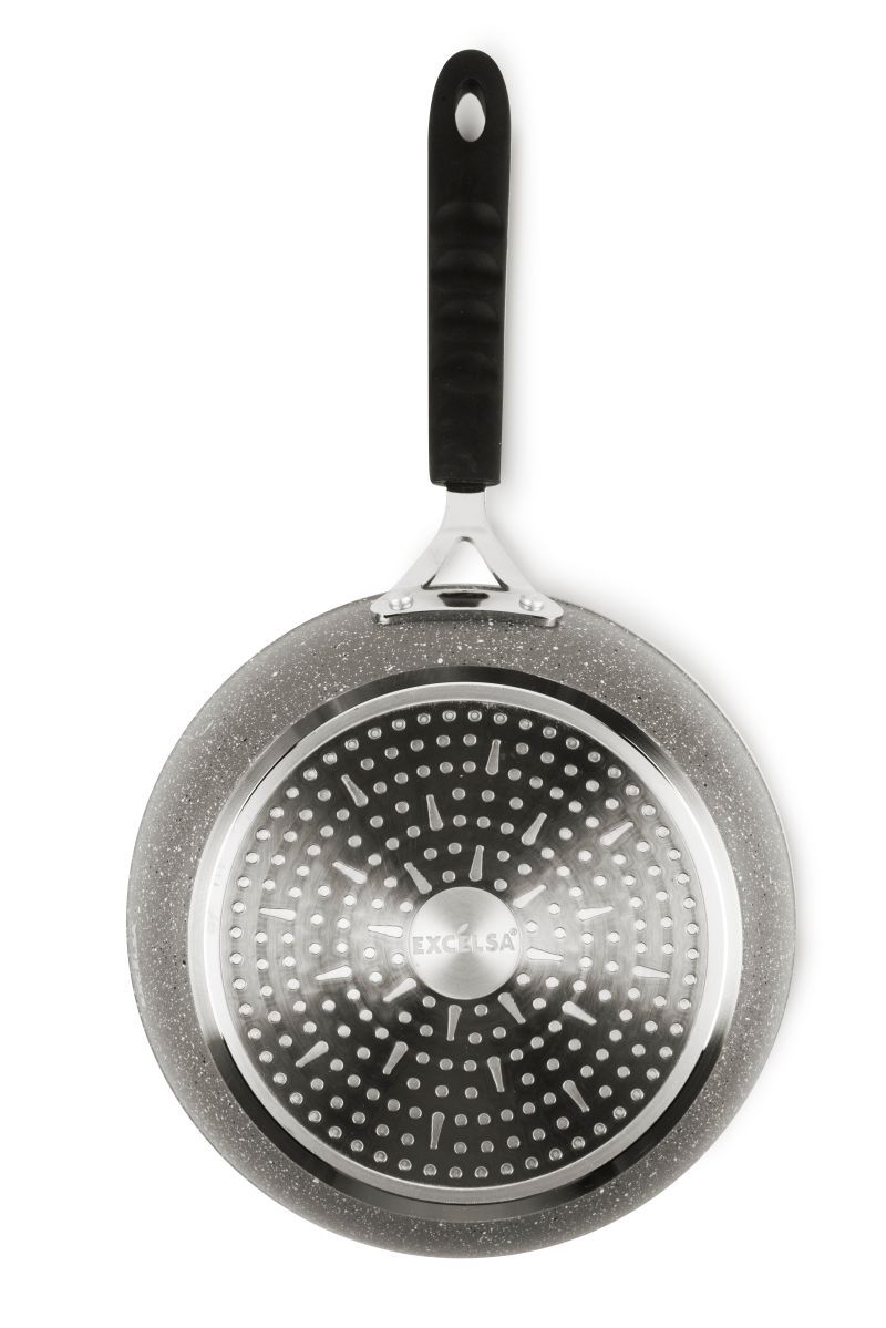 La padella Forn-OK di Excélsa da cm 24 con 1 manico lungo ha il corpo in alluminio forgiato con rivestimento antiaderente a 5 strati in Pfluon, effetto pietra con particelle minerali. Il manico è soft touch con segnalatore termico.