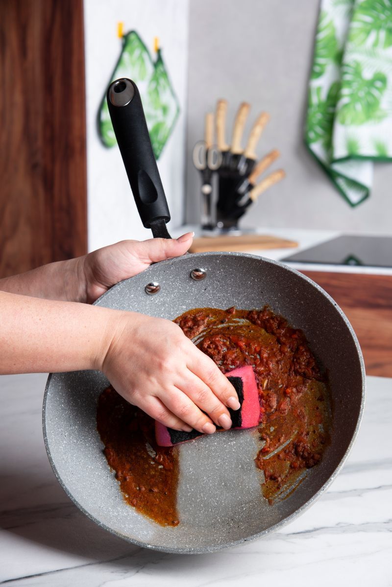 - Per rimuovere le macchie tenaci, versare dell’acqua bollente nel prodotto in modo da ammorbidirle. Pulire con un detergente non corrosivo. Risciacquare e asciugare accuratamente.