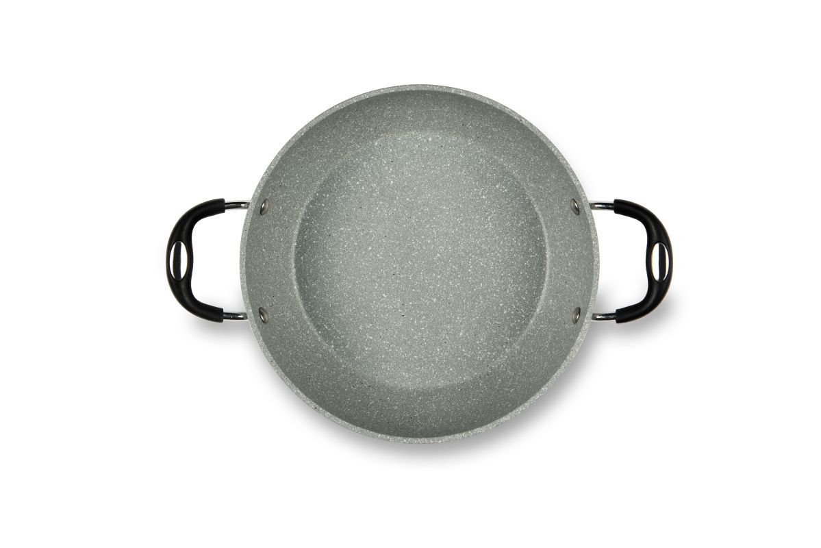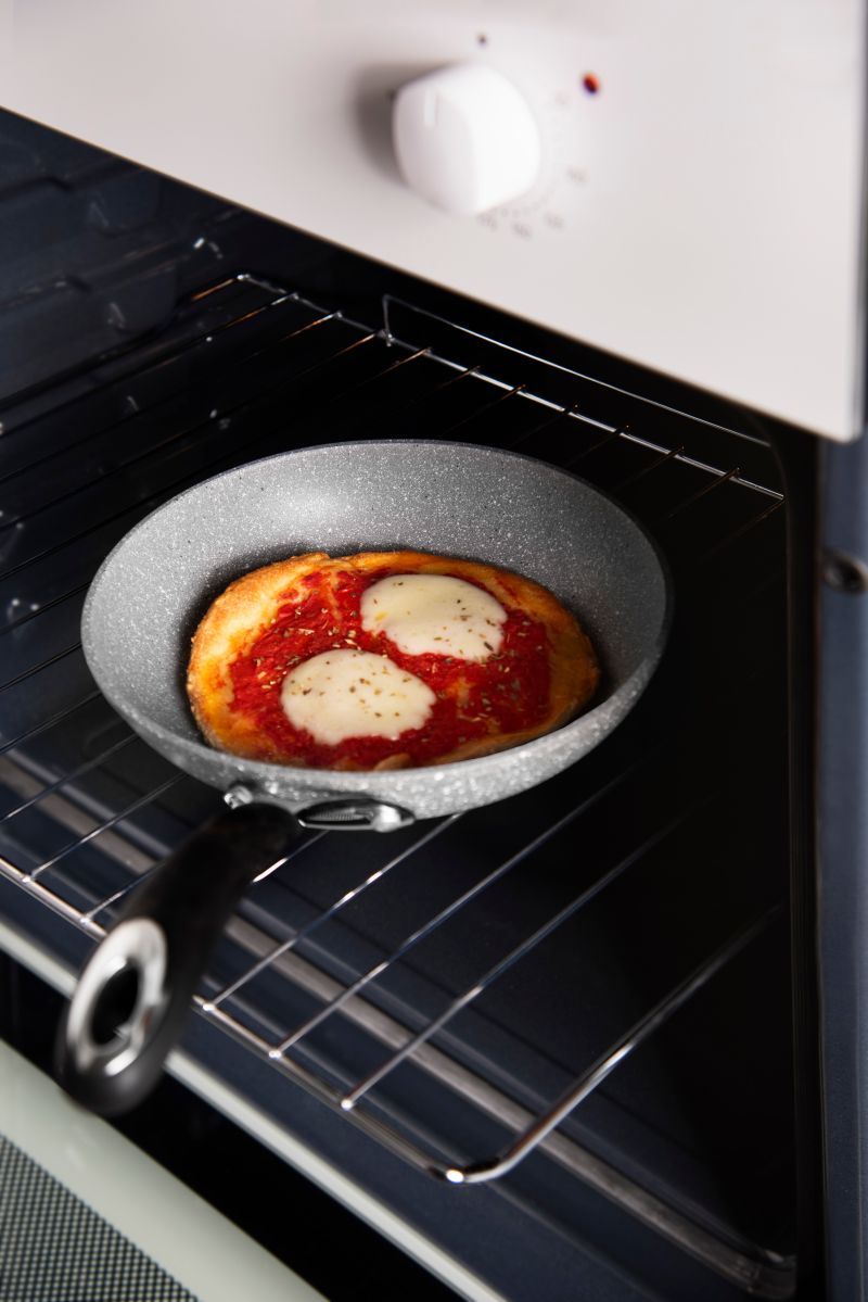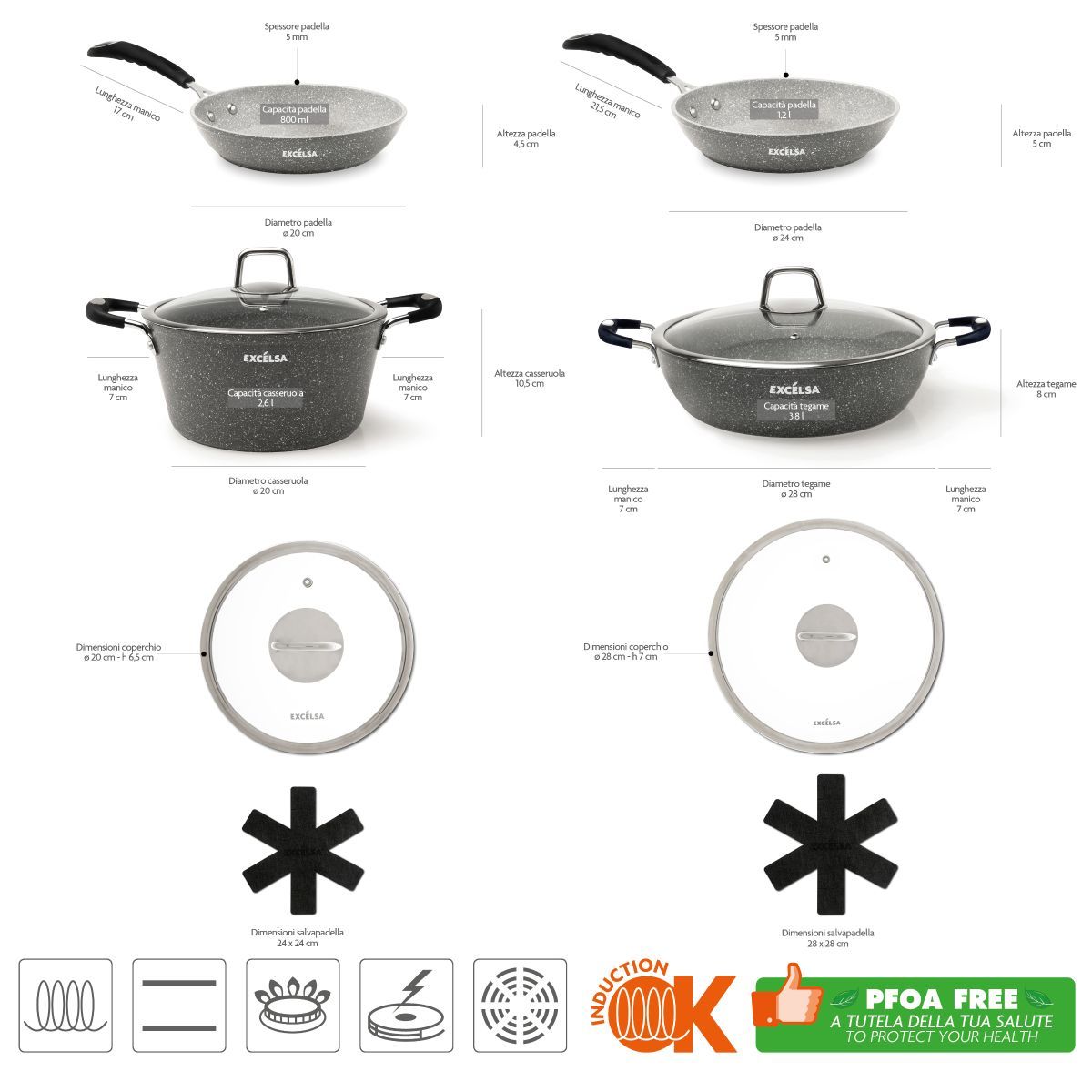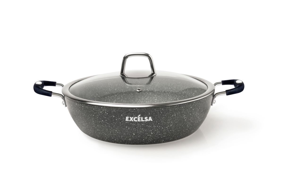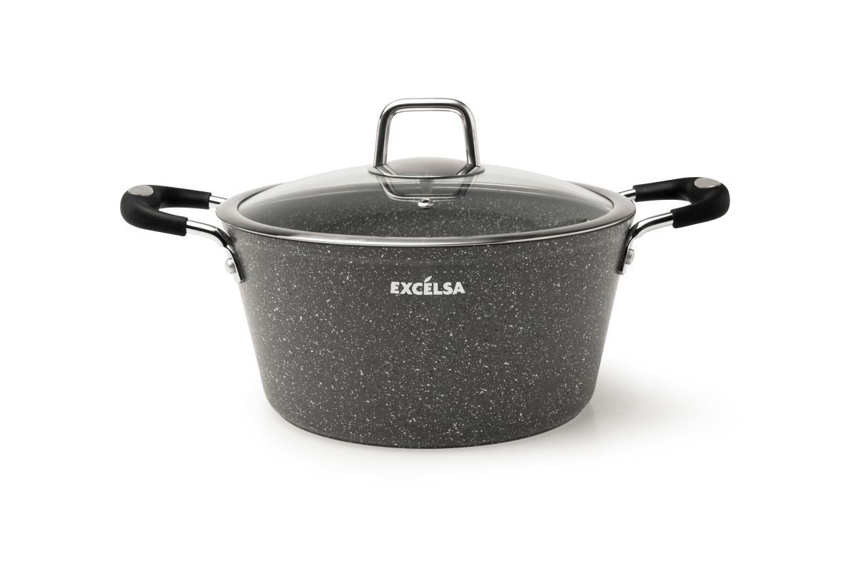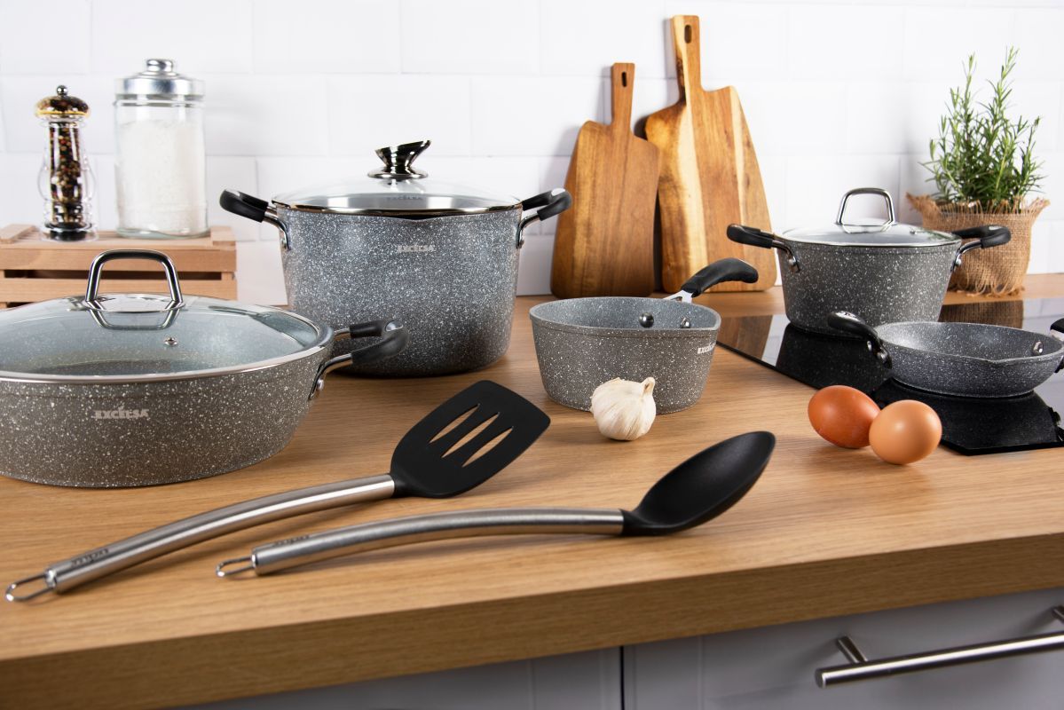 Il set da 6 pezzi di pentole e padelle Forn-OK di Excélsa hanno il corpo in alluminio forgiato con rivestimento antiaderente a 5 strati in Pfluon, effetto pietra con particelle minerali. Il manici sono soft touch.