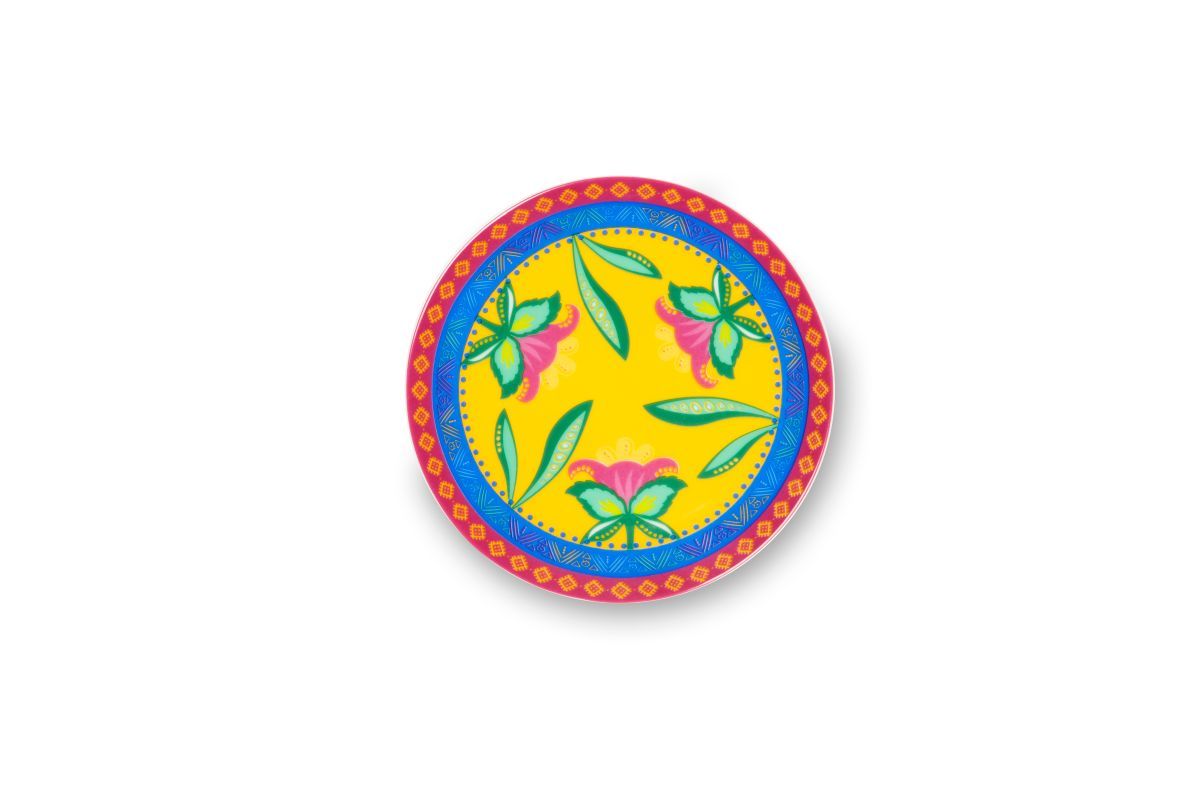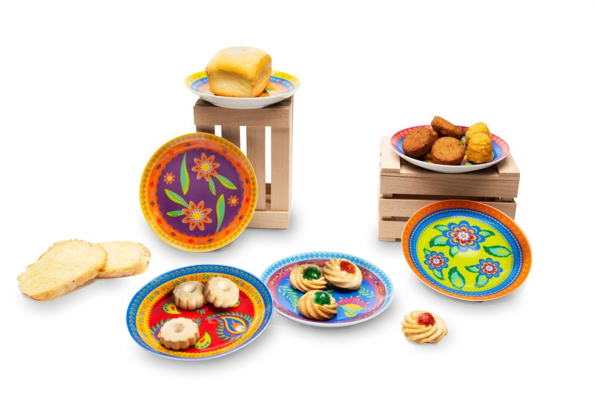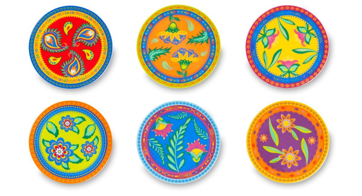 I piatti per aperitivo Gipsy, a fantasia multicolore, sono perfetti per servire dolce e salato ai tuoi ospiti. Il set comprende 6 piattini da 15 cm di diametro coordinabili con gli altri articoli della stessa collezione. Ogni piatto ha una personalizzazione diversa e sono contenuti in una scatola litografata.