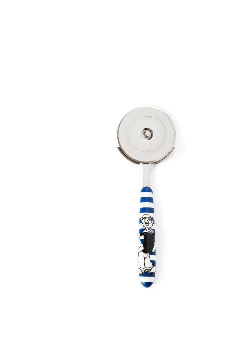 La rotella è in acciaio inox con manicatura in plastica decorata con la figura di Popeye sul fondo a strisce. Interamente prodotta in Italia.