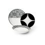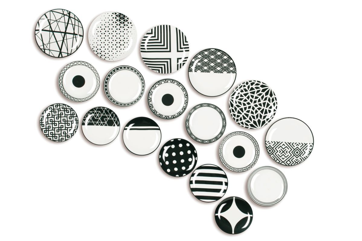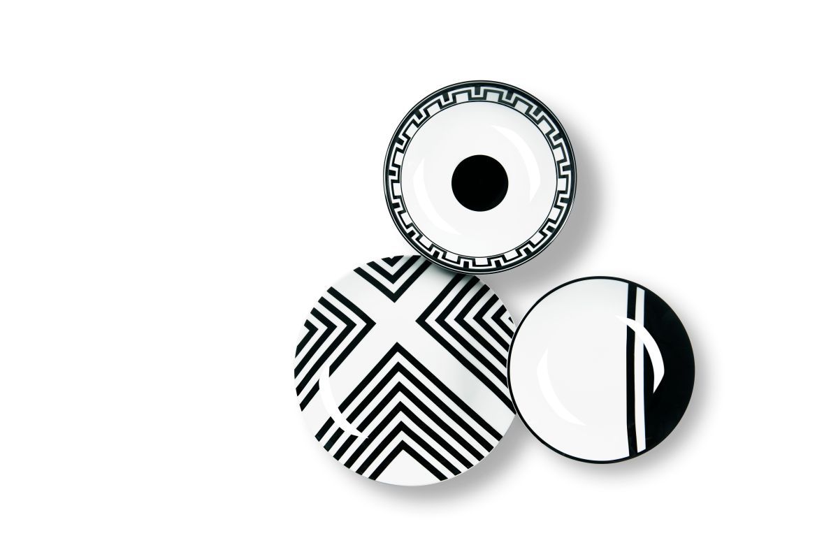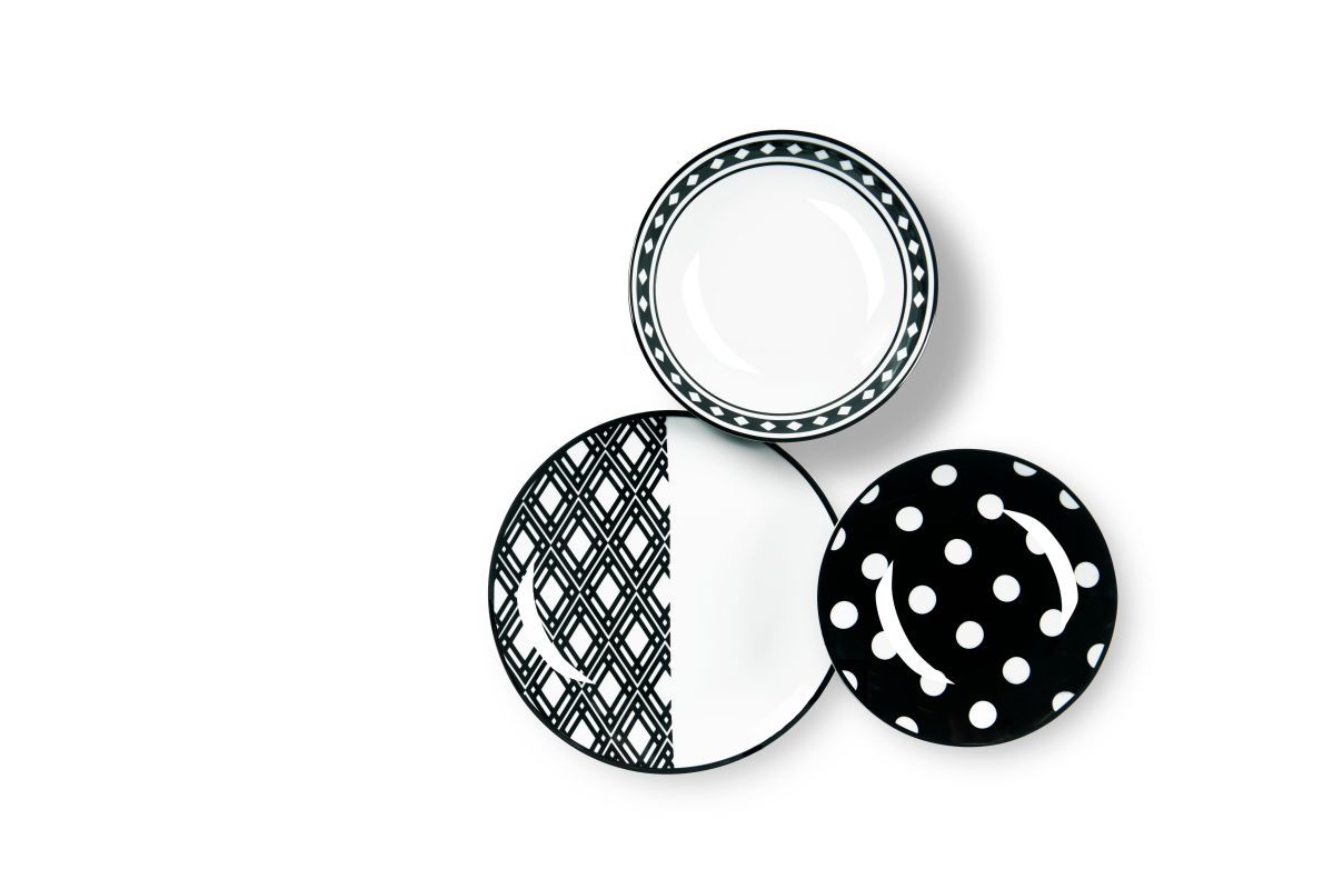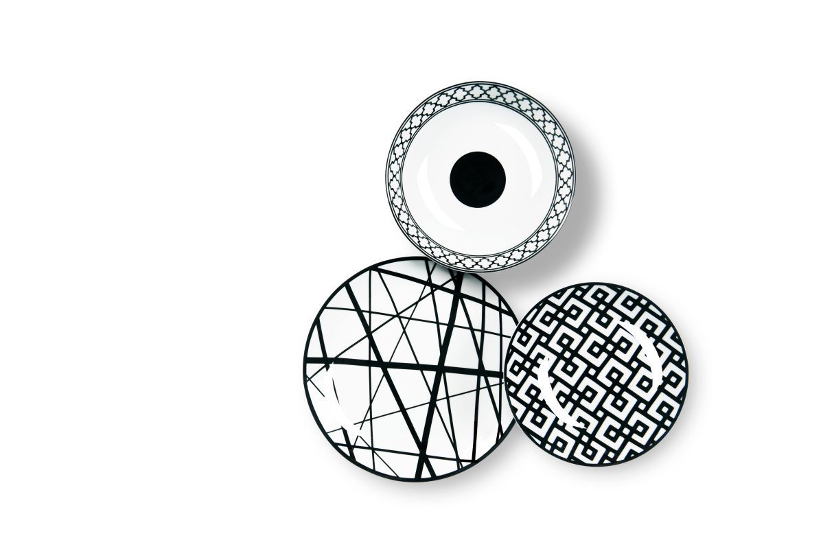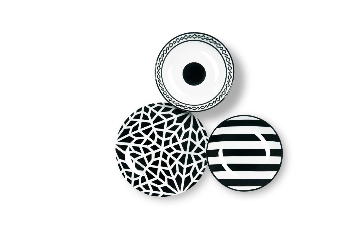 Linee bianche e nere si incrociano e rincorrono su piatti in porcellana finissima, a formare eleganti motivi geometrici. Bordature bicromatiche decorano in modo semplice, ma raffinato i bellissimi piatti fondi. Righe, pois, zig zag black & white trasformano gli elementi di questa linea in stampe d’artista.