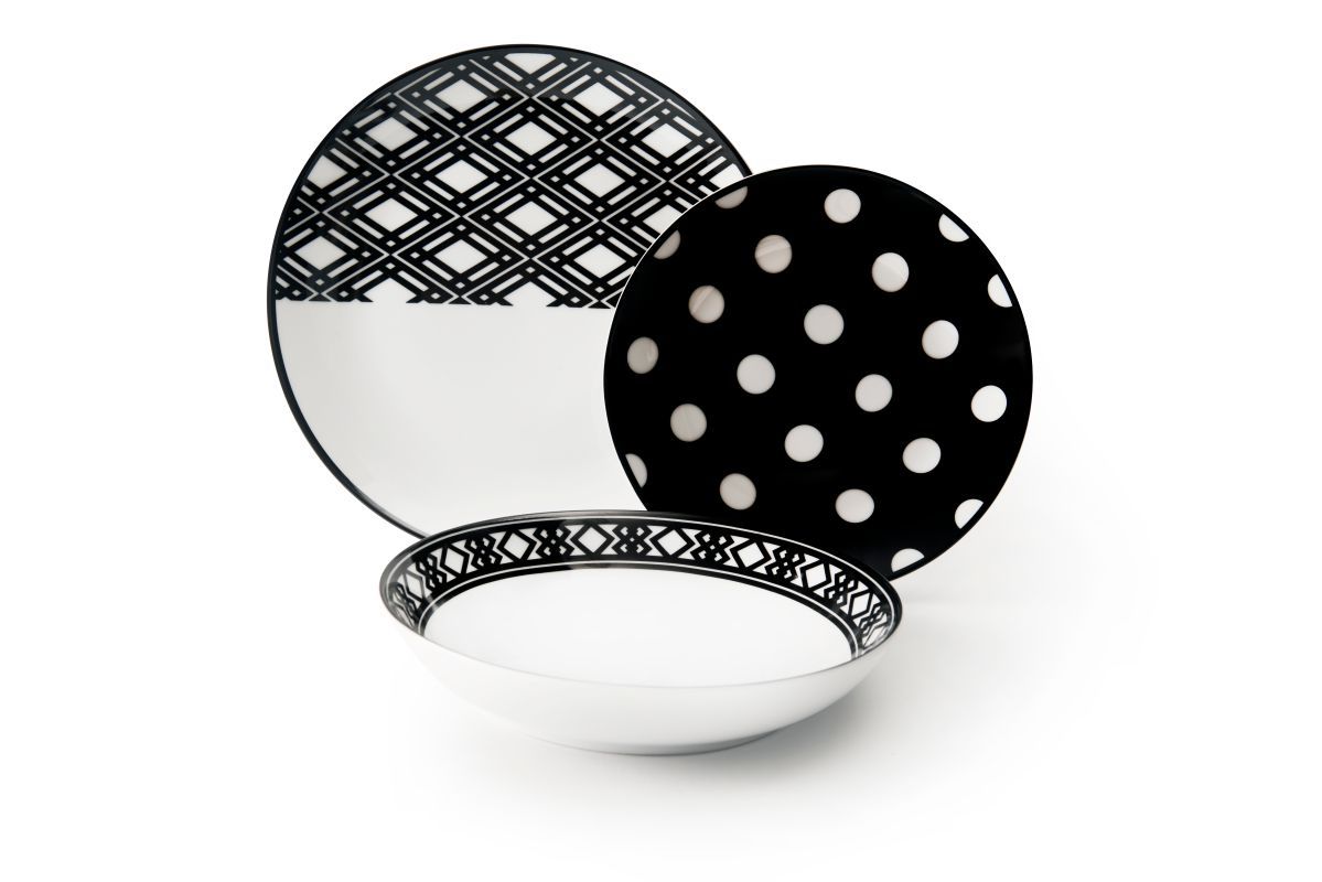 Servizio piatti, bianco/nero, optical, porcellana, 18 pezzi