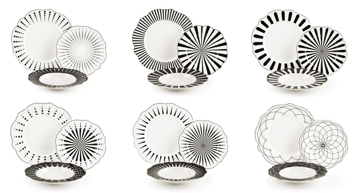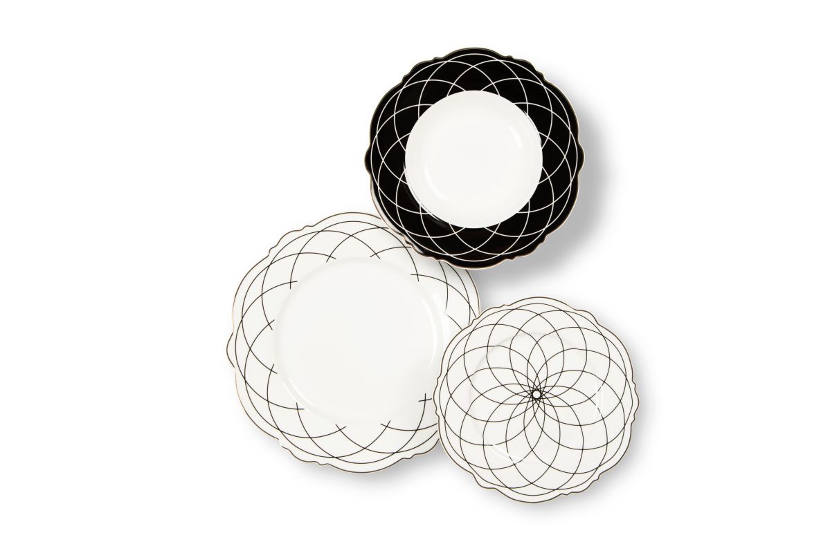 Servizio piatti, geometrie filo oro, porcellana, 18 pezzi