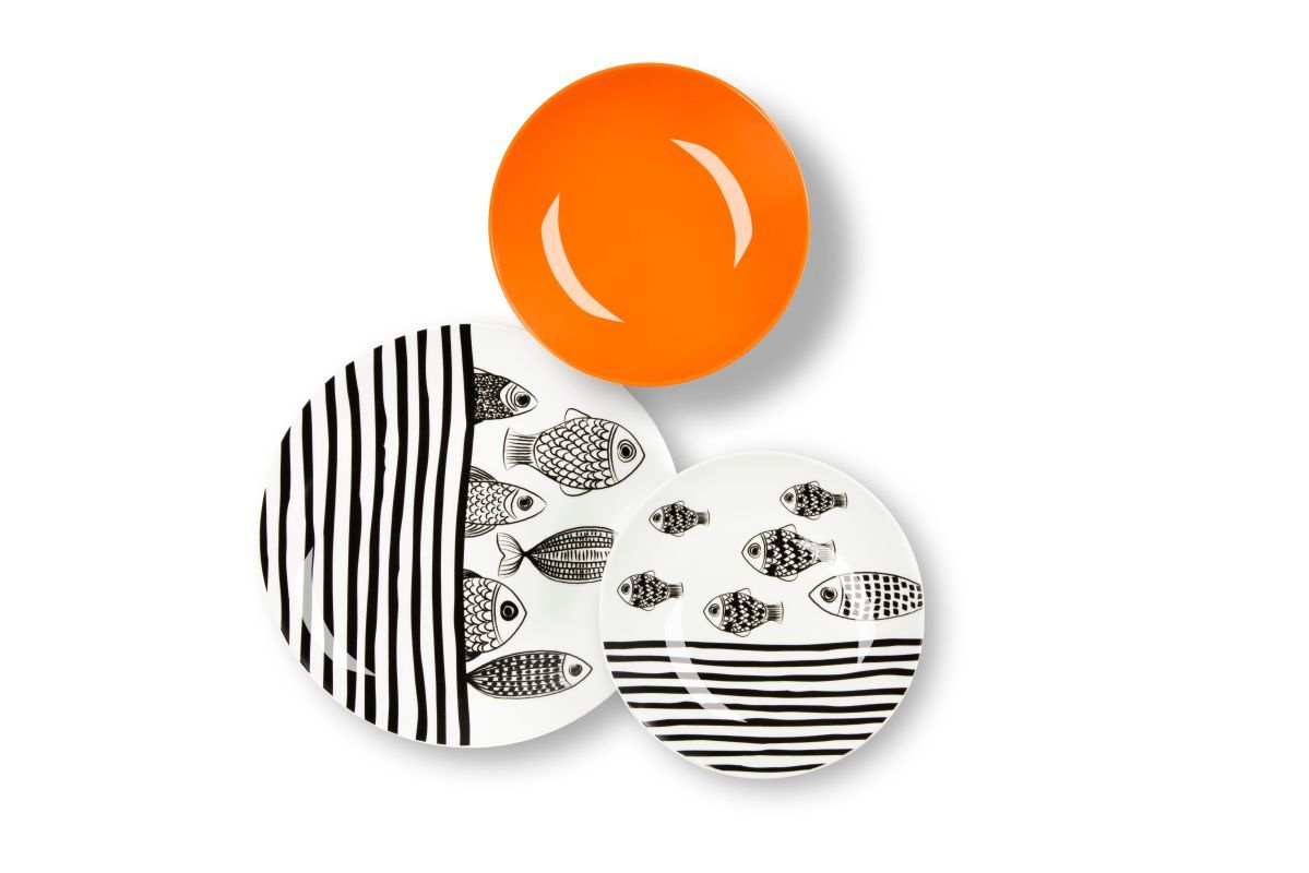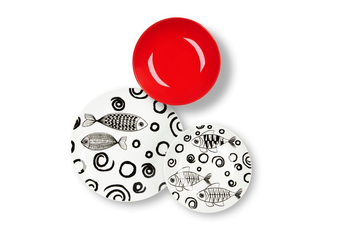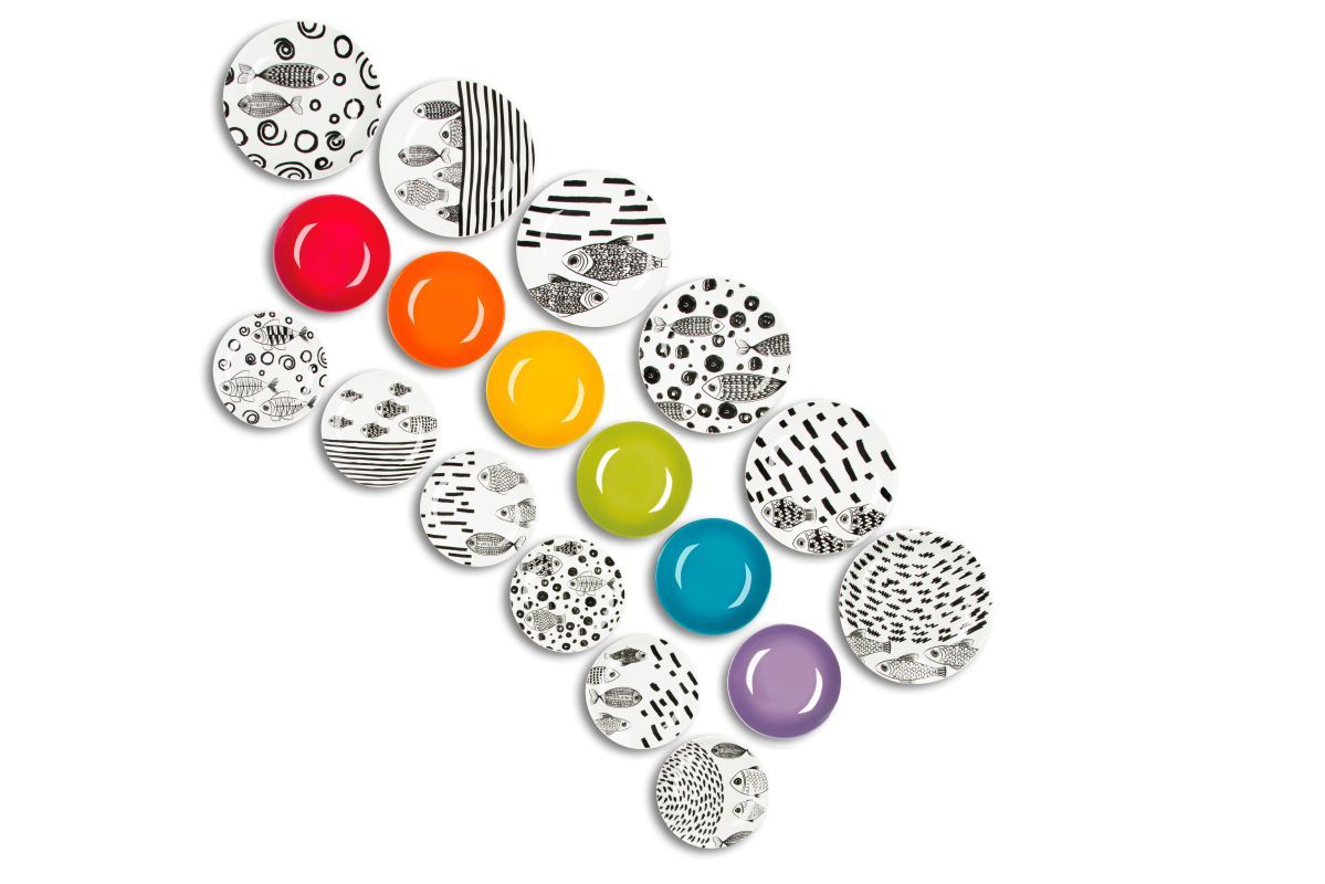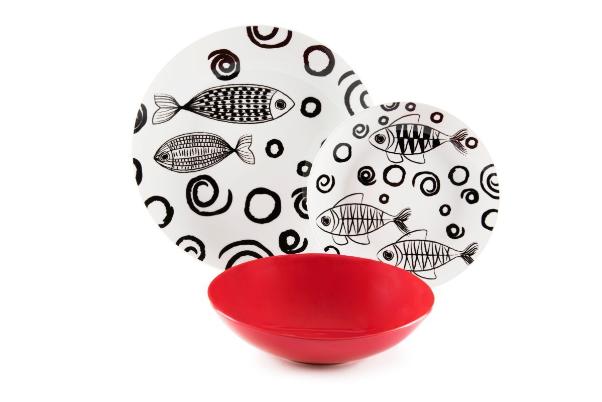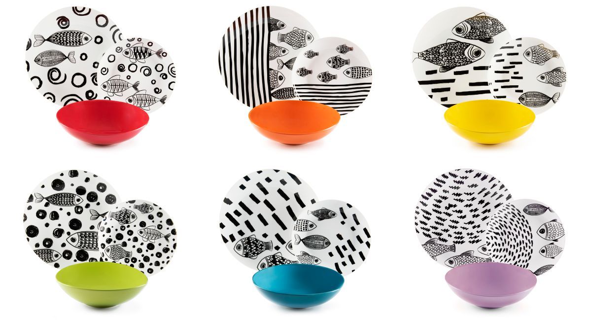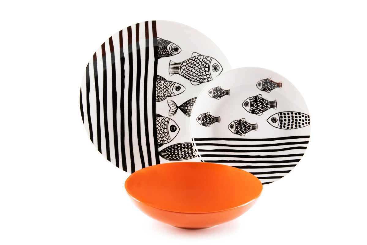 L'insolito accostamento di bianco/nero e colore è la caratteristica che si percepisce a colpo d'occhio nel servizio piatti da 18 pezzi Black Fishes. Pesci disegnati con outline nera decorano le superfici dei piatti quasi ad avere la sensazione di essere immersi in un acquario stilizzato.