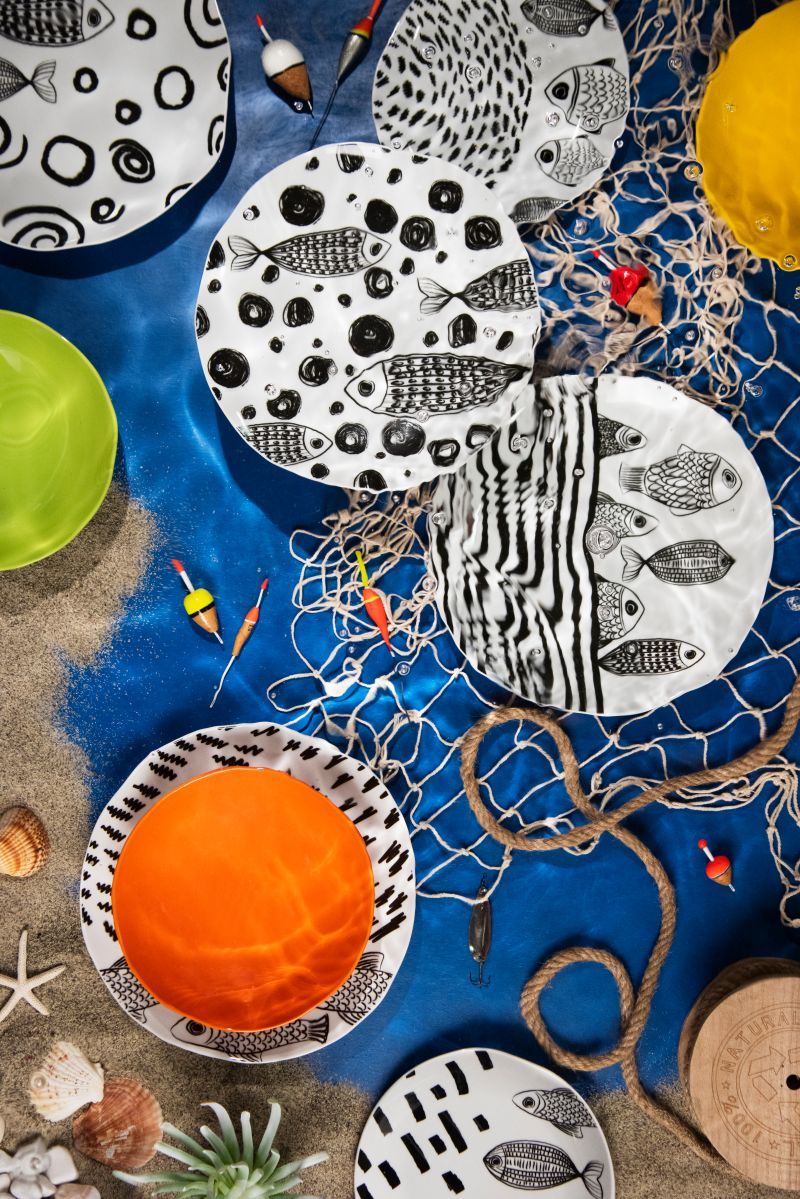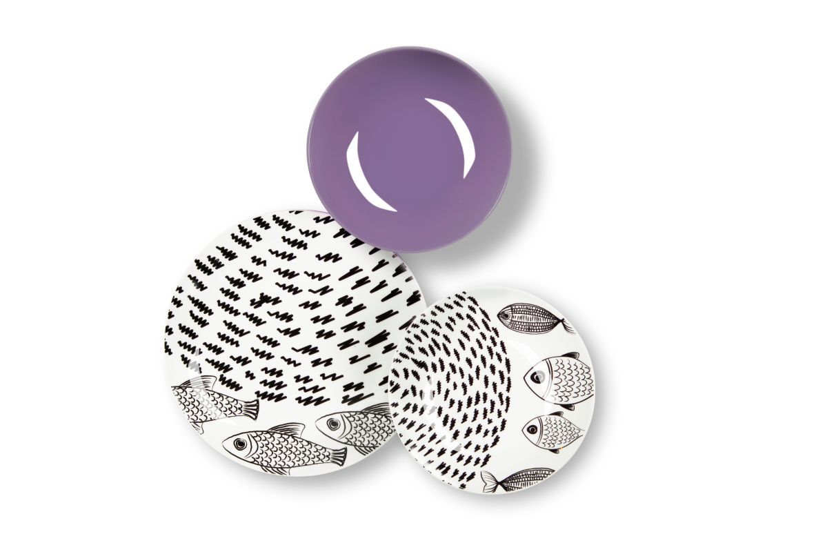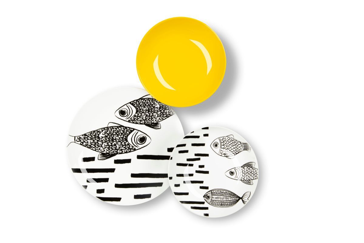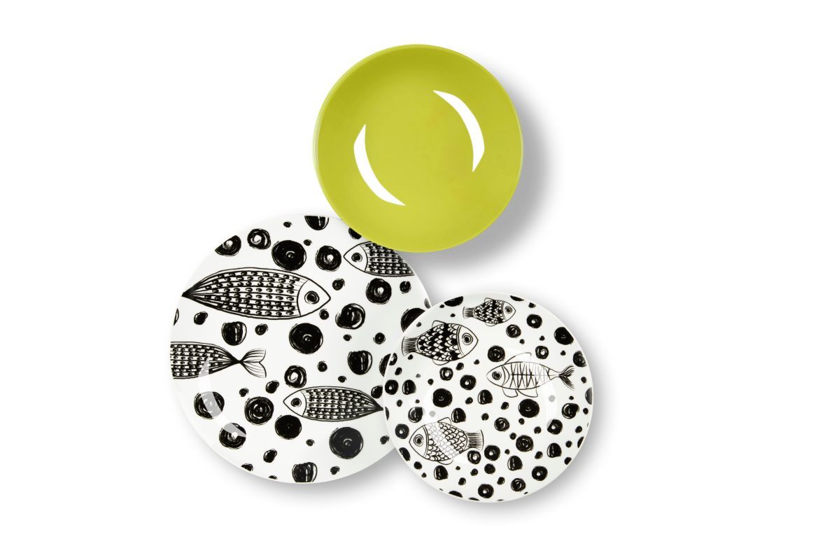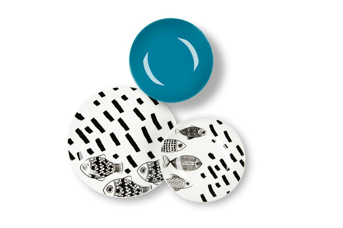 L'insolito accostamento di bianco/nero e colore è la caratteristica che si percepisce a colpo d'occhio nel servizio piatti da 18 pezzi Black Fishes. Pesci disegnati con outline nera decorano le superfici dei piatti quasi ad avere la sensazione di essere immersi in un acquario stilizzato.