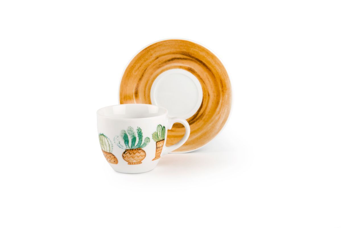 Ogni tazzina è finemente decorata con cactus in coordinato con il piattino colorato. La pregevolezza di questo set risiede proprio nella decorazione, dipinta a mano, dalla creatività degli artisti incaricati.