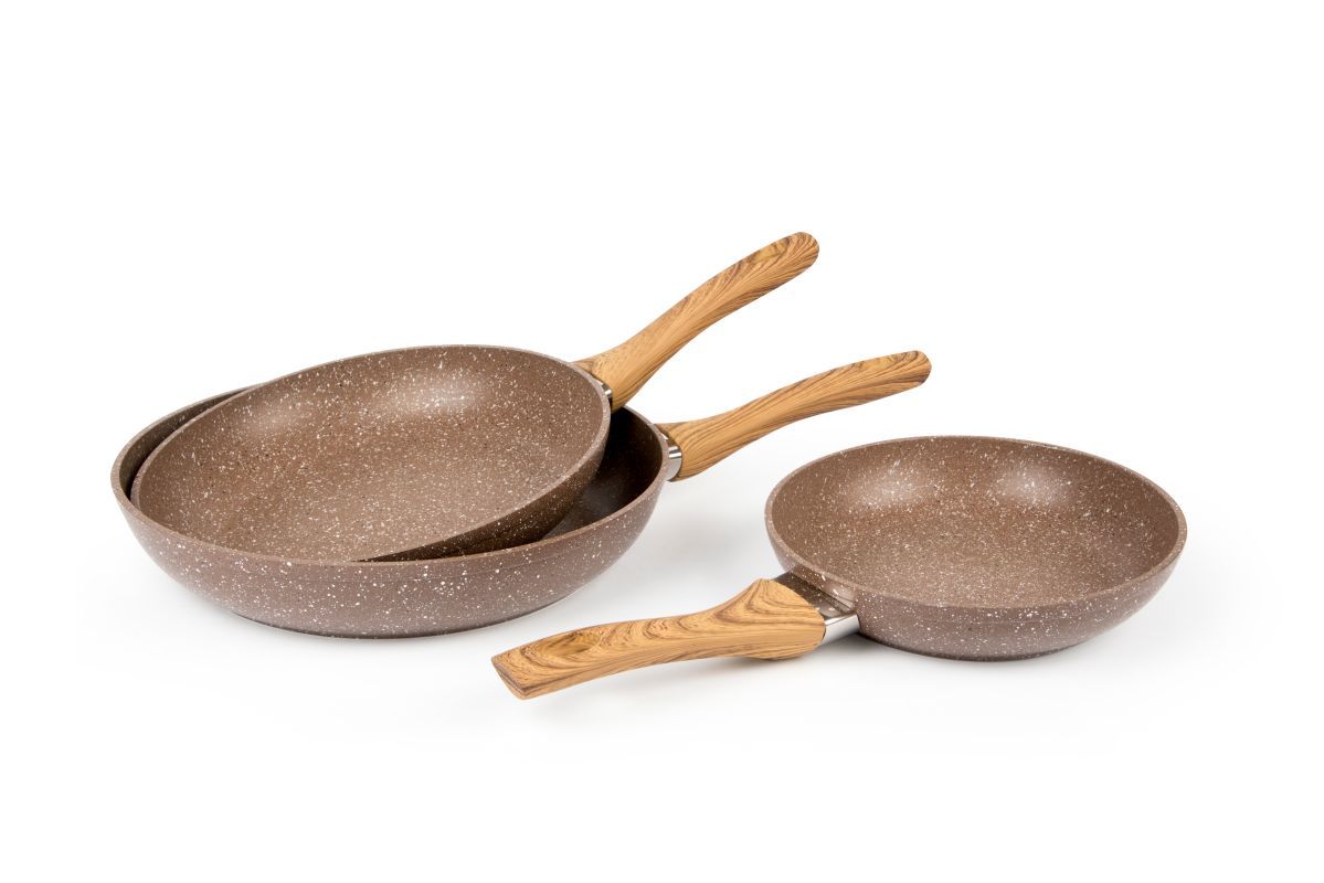 Set di padelle, 3 pezzi, effetto legno e pietra