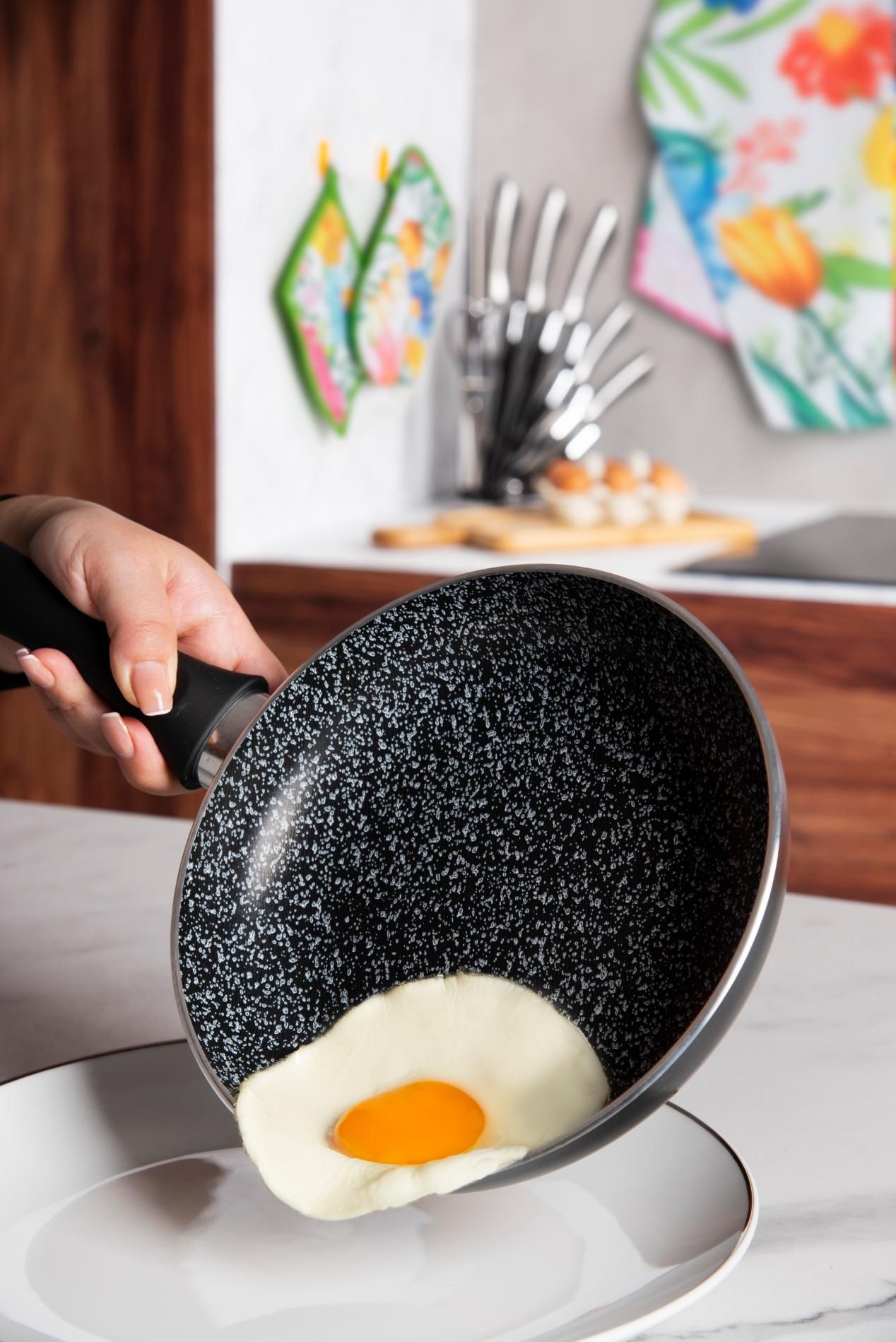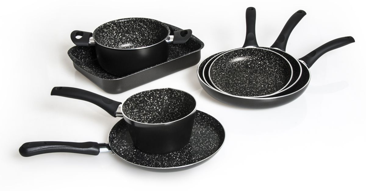 Il set di padelle e pentole Rock'n Cook di Excélsa è composto da 3 padelle di diametro 20, 24, 28 cm, 1 casseruola con due manici da 20 cm, 1 casseruola con un manico da 16 cm, 1 lasagnera e 1 crepiera da 25 cm. Il rivestimento antiaderente a 5 strati è rinforzato con particelle minerali per garantire alta resistenza a graffi e abrasioni, ma al contempo massima antiaderenza dei cibi garantita dal rivestimento Dylon PFOA Free.