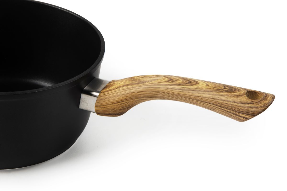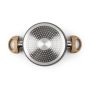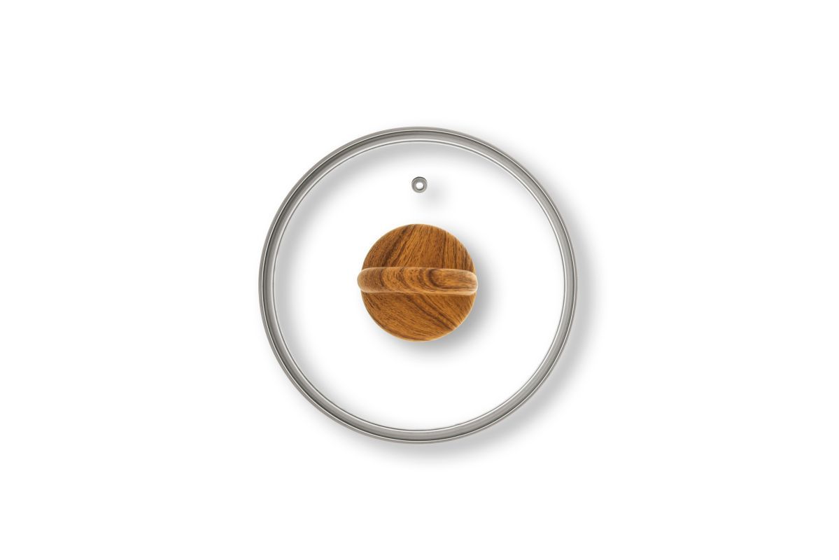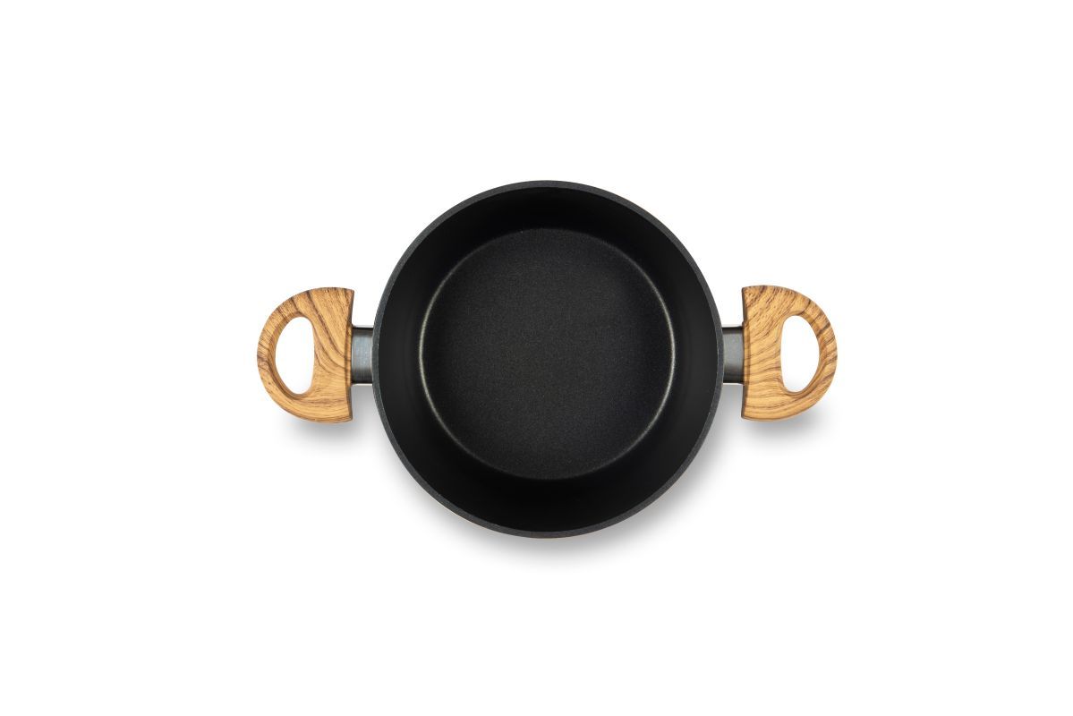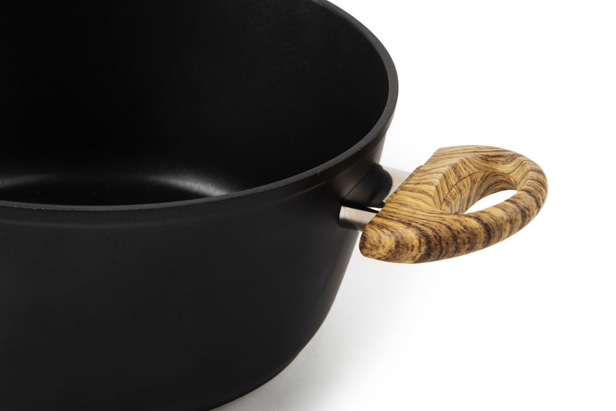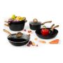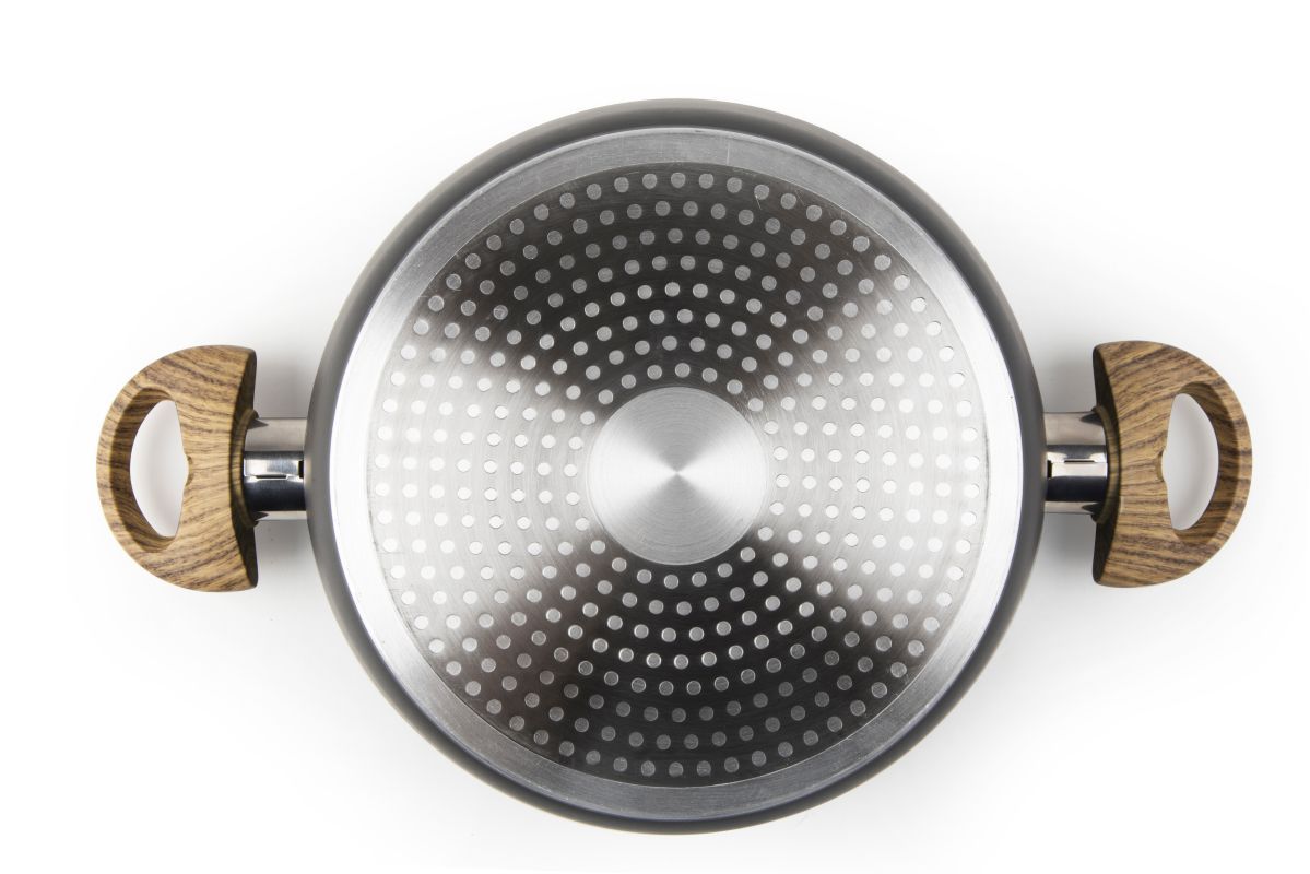 Pratika di Excélsa è la batteria da 9 pezzi bella alla vista e piacevole al tatto: in alluminio forgiato per garantire resistenza e uniformità in cottura, nickel free, con manici in bachelite soft touch con effetto legno, coperchi in vetro con valvola di sfiato.