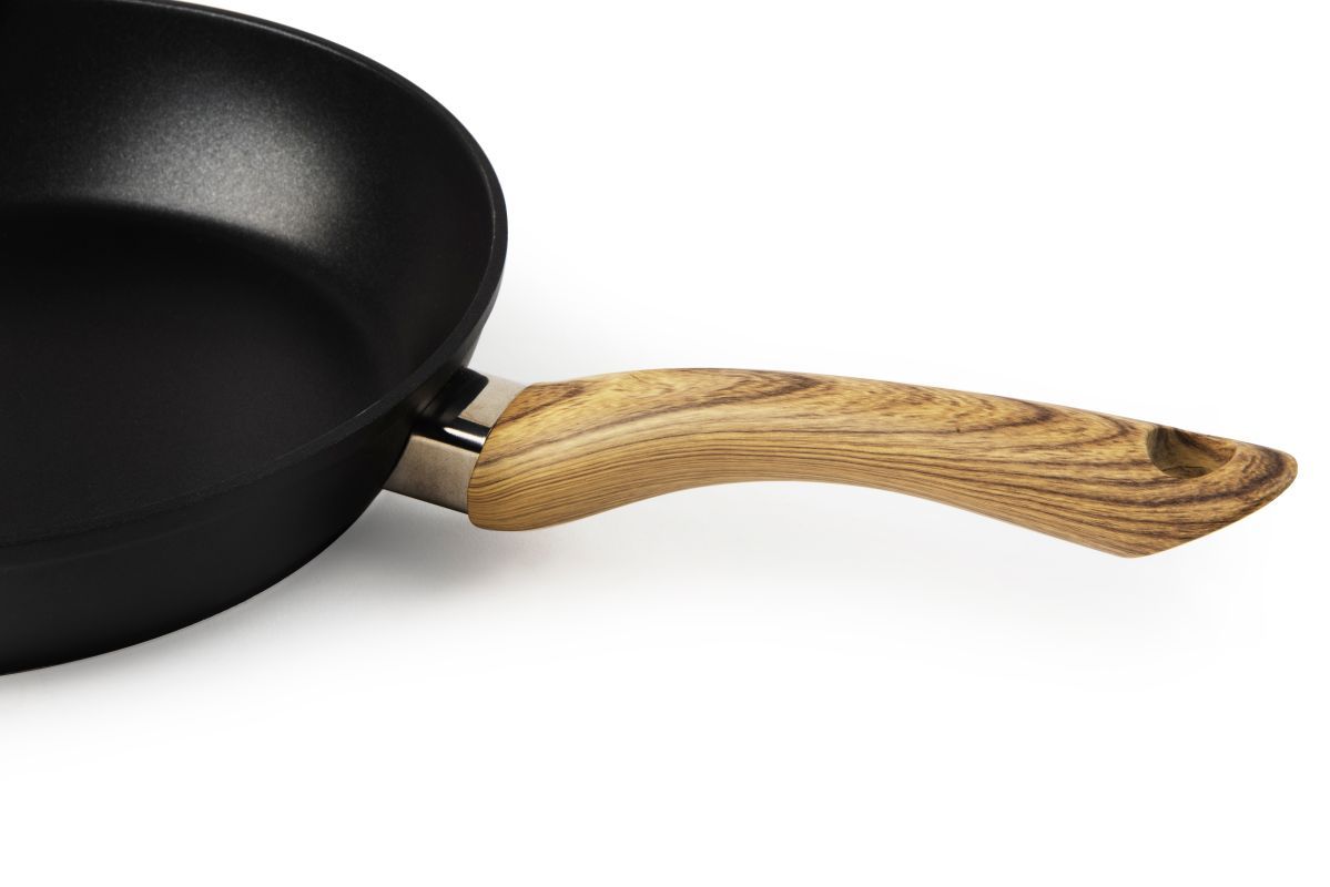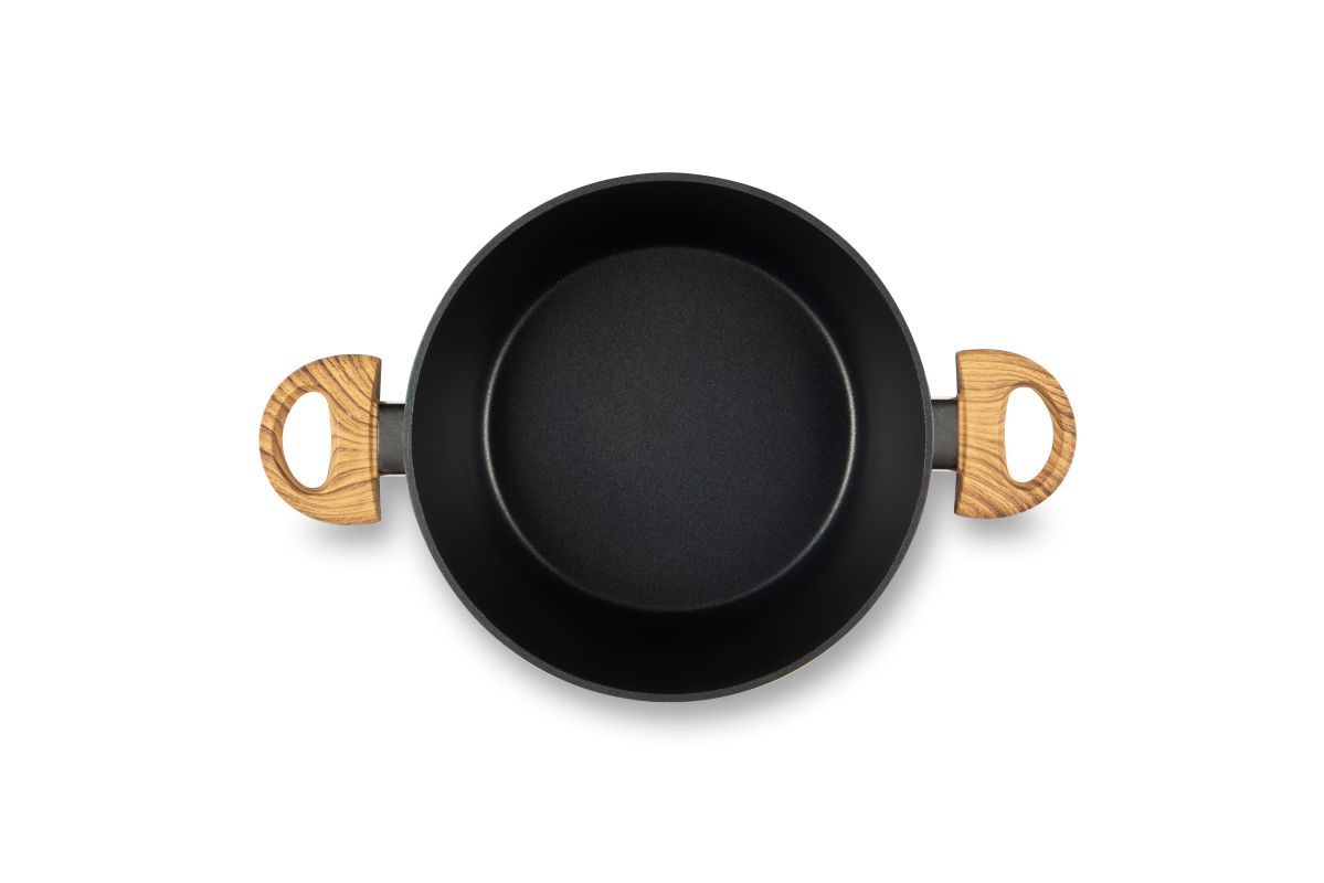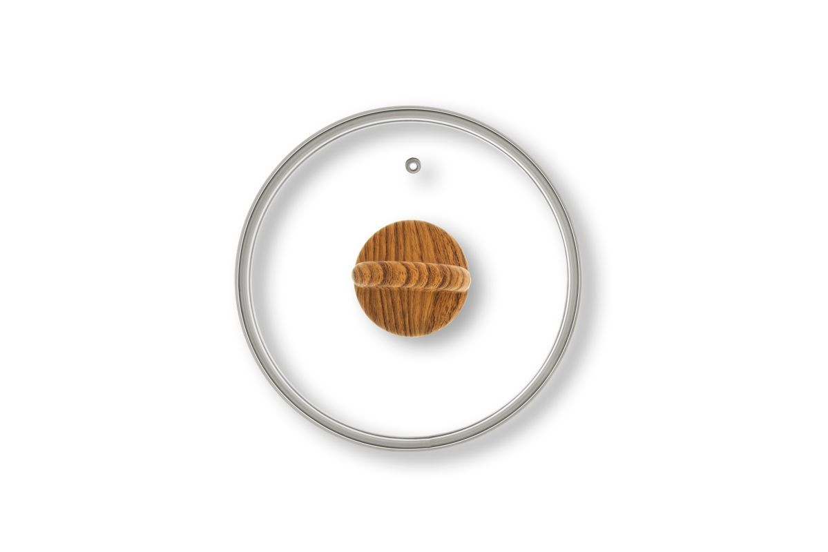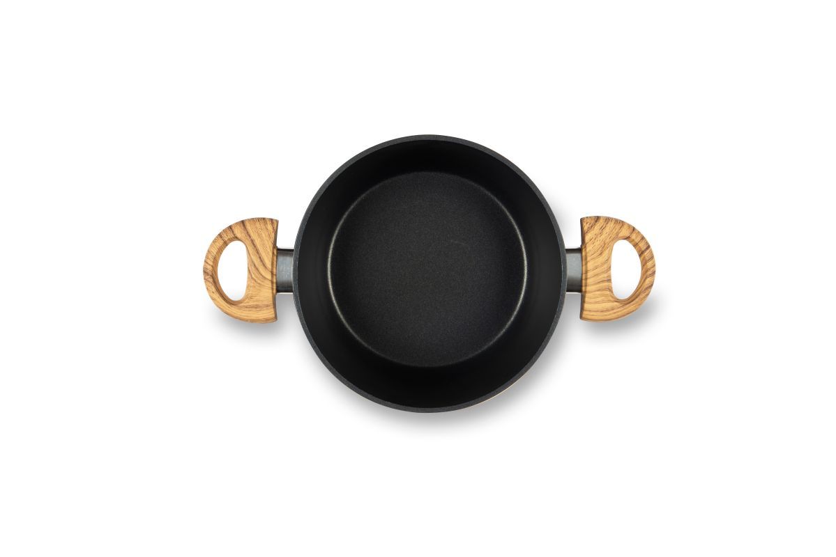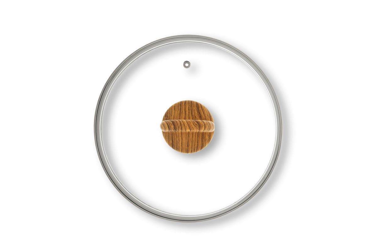 Pratika di Excélsa è la batteria da 9 pezzi bella alla vista e piacevole al tatto: in alluminio forgiato per garantire resistenza e uniformità in cottura, nickel free, con manici in bachelite soft touch con effetto legno, coperchi in vetro con valvola di sfiato.
