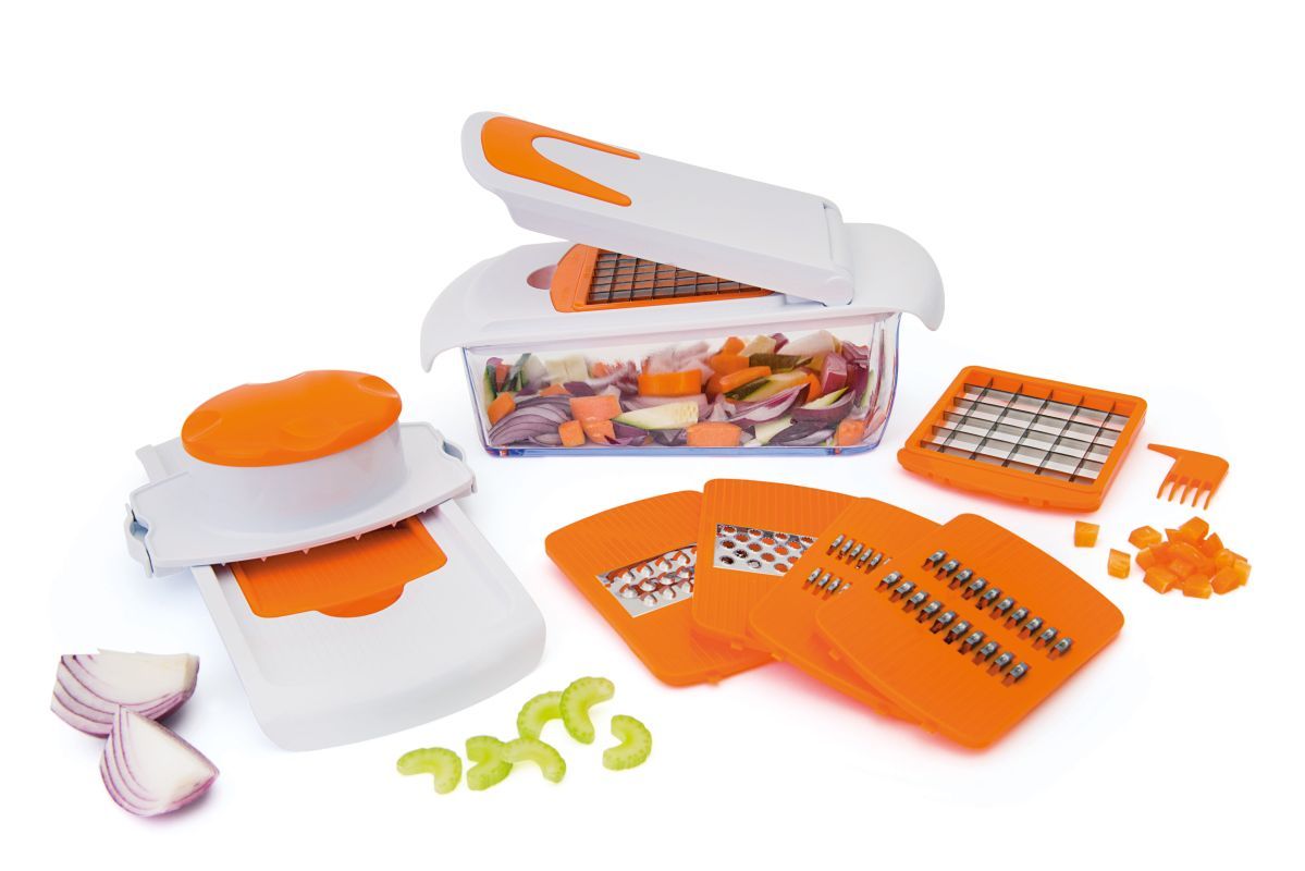 Abili di Excélsa è il set taglia e affetta tutto in uno con 7 lame intercambiabili in acciaio inox con impugnatura e base antiscivolo ideale per tagliare, tritare, affettare, grattugiare, tagliare a cubetti, tagliare a julienne.