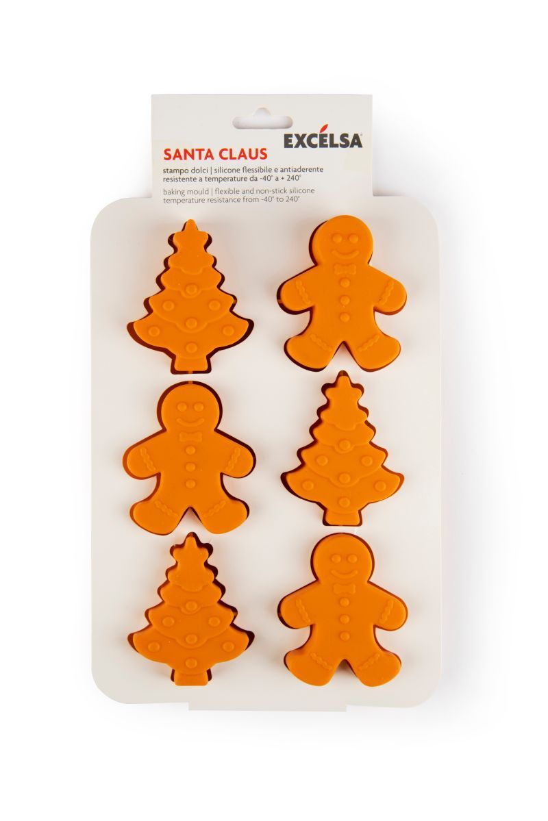Santa Claus è lo stampo in silicone a forma di albero di natale e omino resistente alle alte temperature, flessibile e antiaderente. La sua tenuta è garantita da a -40°C a +240°C.