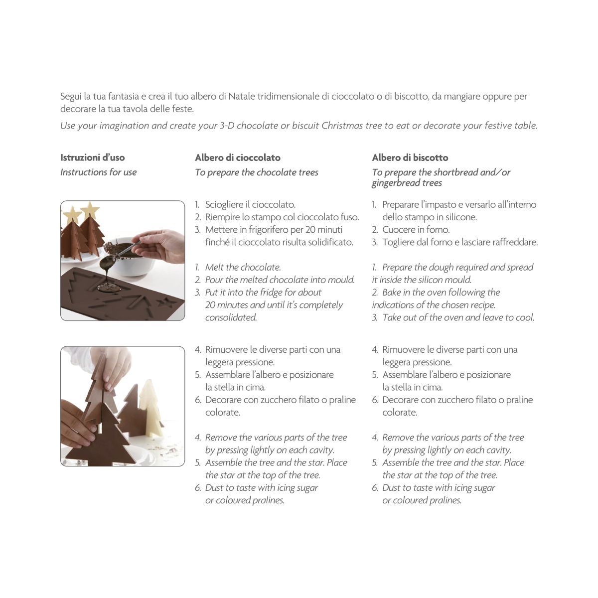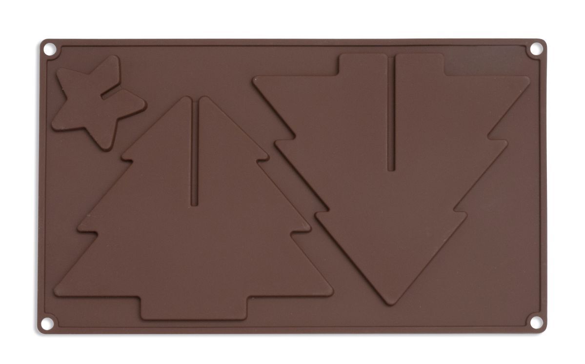 L'utilizzo ad incastri delle forme create permette di ottenere un Albero di Natale in 3 dimensioni di cioccolato e/o di biscotto di altezza 14 o 10,5 cm.