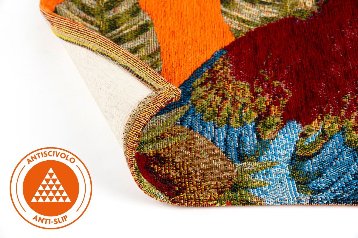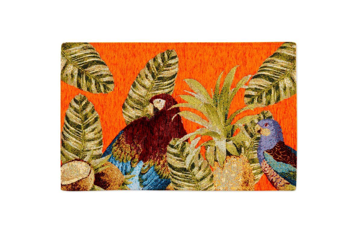 Colorato e coordinabile agli altri prodotti della collezione Havana, questo tappeto è caratterizzato da una tecnica di tessitura jacquard, ossia fili tinti intrecciati che creano una preziosa fantasia con uccelli che richiama lo stile tropicale. Durante la lavorazione sono stati aggiunti dei colori acrilici al filato di ciniglia per dare alla texture maggiore profondità e saturazione.